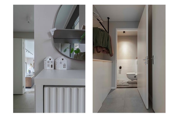 Via de hal betreden we de woning, waar de hoogwaardige afwerking direct opvalt. De stijlvolle lichtgrijze tegelvloer en elegante bordestrap geven de entree een moderne en verzorgde uitstraling. Onder de trap is praktische bergruimte gerealiseerd en er is een fraaie plek voor de garderobe. Vanuit de hal zijn het moderne, zwevende toilet met fonteintje, de meterkast, de de keuken met eetkamer, woonkamer en garage bereikbaar.