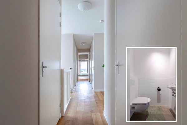 Via de trapopgang bereiken we de ruime overloop op de eerste verdieping. Vanuit hier zijn drie slaapkamers, de badkamer, een apart toilet en de technische ruimte bereikbaar. In de technische ruimte bevinden zich de warmtepomp en het WTW-systeem.