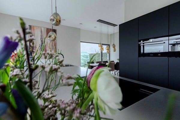 Via een subtiel hoogteverschil wordt de ruime leefkeuken met eetkamer bereikt, wat zorgt voor een speelse en ruimtelijke indeling met een eigen sfeerbeleving. Met een totaaloppervlakte van ca. 45 m² biedt deze leefruimte volop plaats om te koken, tafelen en samen te komen. De moderne keuken vormt een echte eyecatcher dankzij het stijlvolle kookeiland en de royale hoeveelheid opbergruimte. De keuken is uitgerust met luxe inbouwapparatuur, waaronder een Bora kookplaat, vaatwasser, koelkast, combi-stoomoven en een combi oven/magnetron. Daarnaast zorgen een Quooker met bruisend water en airconditioning voor extra comfort. De aangrenzende eetkamer is ruim opgezet en biedt dankzij de grote raampartijen een prachtig uitzicht over de achtertuin.