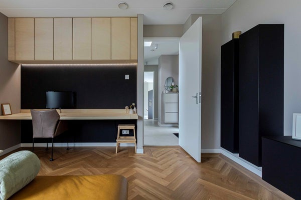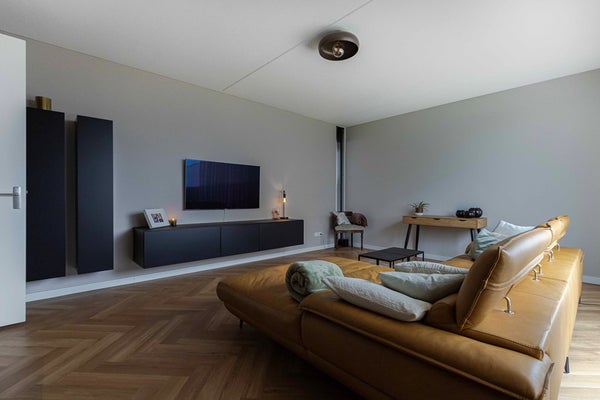 Aan de voorzijde van de woning bevindt zich de sfeervolle woonkamer met een oppervlakte van ca. 27 m², afgewerkt met een warme PVC visgraatvloer met stijlvolle randafwerking. Tevens is hier een praktische werkplek gecreëerd, ideaal voor thuiswerken. De ruimte straalt rust, luxe en comfort uit en sluit naadloos aan bij de strakke, moderne afwerking van de gehele woning.