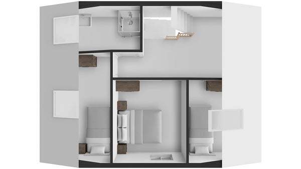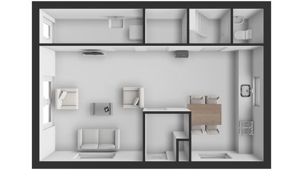 Je komt binnen in de entree met meterkast en garderobe. Vanuit hier stap je direct de leefruimte in, die slim is ingedeeld in een woonkamer aan de ene zijde en een eetkamer/woonkeuken aan de andere zijde. De open opzet zorgt voor een fijne doorloop en een ruimtelijk gevoel.
