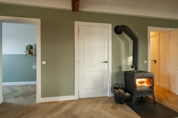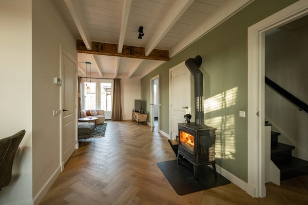 Vanuit de woonkamer is er een mooie verbinding met buiten (dubbele tuindeuren naar het terras), waardoor binnen en buiten prettig in elkaar overlopen. Had ik al gemeld dat er een houtkachel is?