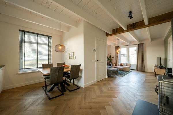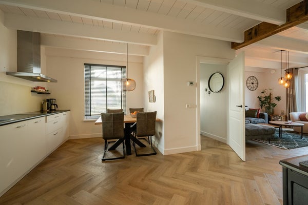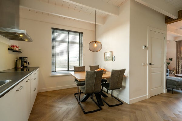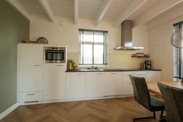 Aan de eetkamerzijde vind je de keukenopstelling (langs de wand) en is er plek voor een grote eettafel: ideaal voor lange avonden tafelen. De keuken is compleet te noemen met een inductie kookplaat, afzuigkap, vaatwasser, combimagnetron en een koelkast.