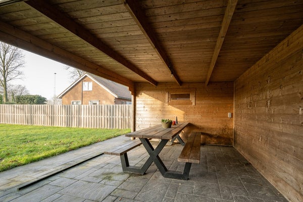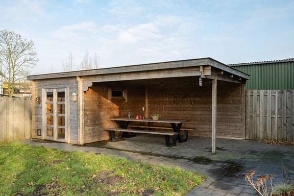 De berging (circa 10 m2) met aangrenzende overkapping is bovendien ideaal voor opslag én als beschutte zitplek.