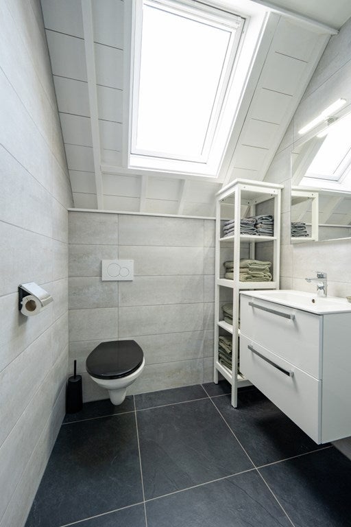 • de luxe uitgevoerde badkamer, met inloopdouche, 2e toilet en een wastafelmeubel. De kamers zijn fijn van formaat en door de kapvorm en dakramen hebben ze een prettige sfeer en lichtinval.