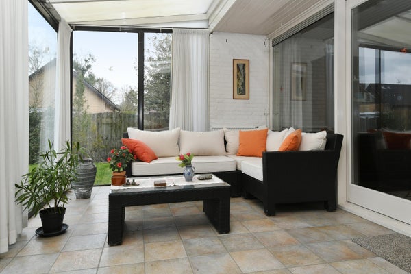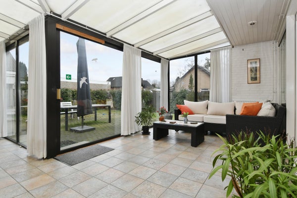 De tuinkamer is een heerlijke ruimte, welke de gezellige sfeer helemaal compleet maakt. Zelfs bij regenachtig weer kun je nog heerlijk genieten van het buitenleven. Bij mooi en zonnig weer kan deze tuinkamer geopend worden met de schuifpui. Vanuit de tuinkamer alsook de tuin zelf is de aangebouwde berging te bereiken. Ideaal voor het stallen van de fietsen of voor al je tuingereedschap. Ook is hier een wastafel met kraan aanwezig. Ideaal na een dagje werken in de heerlijke tuin.