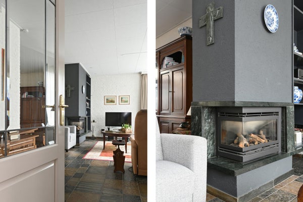 In de woonkamer bevindt zich een sfeervolle gashaard.