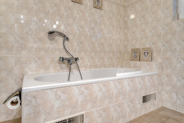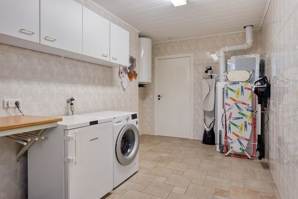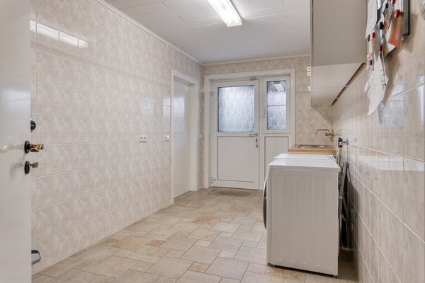 Aan de achterzijde is de bijkeuken (12m2) met aansluitingen voor wasmachine en droger, de verwarmingsketel (Brink 2018) en de boiler. Hier is ook de doorgang naar de garage (26m2) en naar de tuinkamer/serre (27m2). De badkamer bevindt zich aan de achterzijde van de woning en is voorzien van een ligbad, dubbel wastafelmeubel, douchecabine en toilet. Naast de badkamer is de slaapkamer (16.5m2).