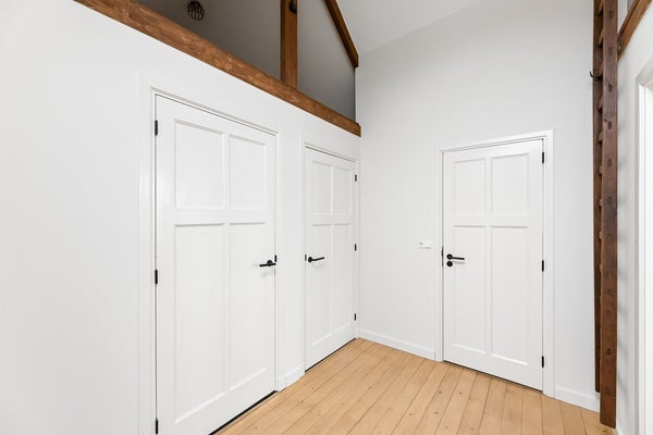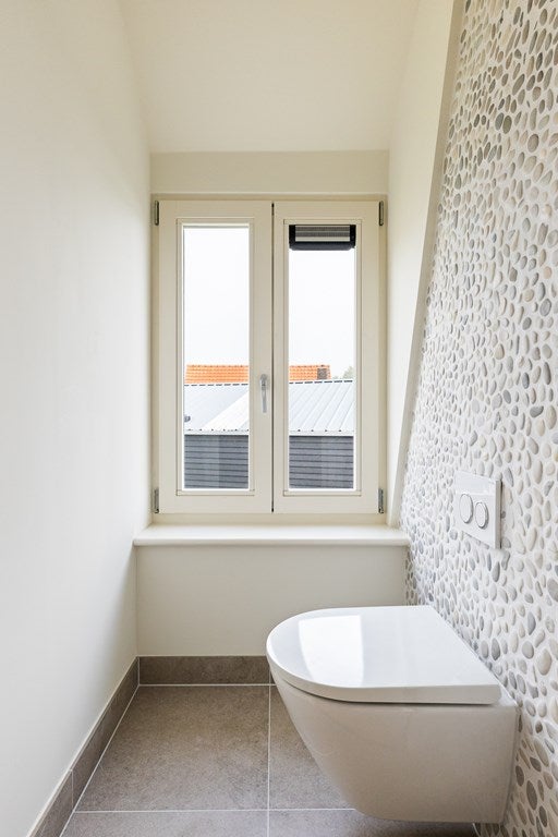 overloop met houten vloerdelen en sfeervolle toiletruimte. Tweede badkamer voorzien van elektrische vloerverwarming, luxe inloopdouche met hand- en regendouche en een wastafel met meubel. 3 Slaapkamers (ca. 16 m², ca. 10 m² en ca. 11 m²) waarvan de kamer aan de voorzijde is voorzien van vaste kastruimte en houten vloerdelen en één kamer is voorzien van een pvc vloer met wasmachine- en drogeraansluiting en opstelling van de warmtepomp. Deze laatste kamer zou dienst kunnen doen als logeerkamer, kantoor en-/of kledingkamer. Vanuit deze kamer is er ook toegang tot het platte dak.