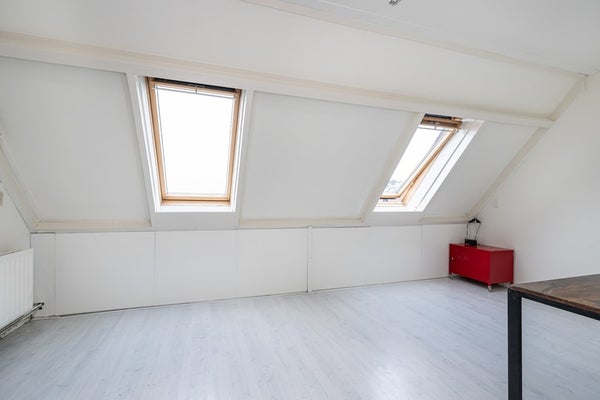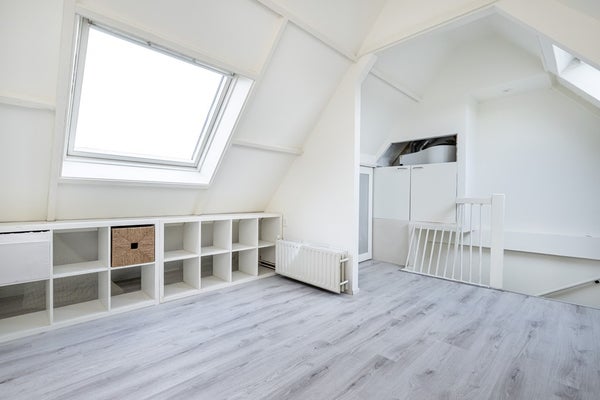 Laminaatvloer, 2 x Velux dakraam, radiator en bergruimte achter knieschot.