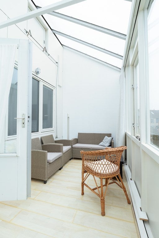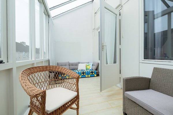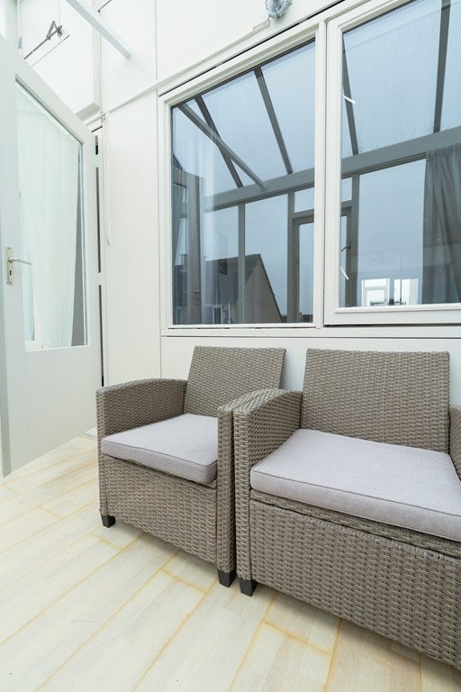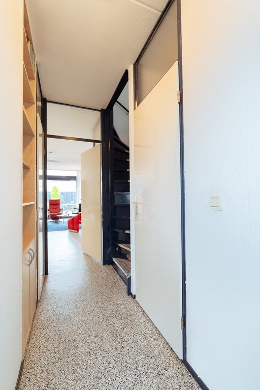 De trap leidt naar de overloop van de eerste verdieping. Dankzij de rechte wanden wordt elke vierkante meter hier optimaal benut. De verdieping telt drie volwaardige slaapkamers. Bijzonder is de grote serre aan de achterzijde, die direct grenst aan een van de kamers. Deze serre is niet alleen een heerlijke plek om te vertoeven met zicht op de omgeving.