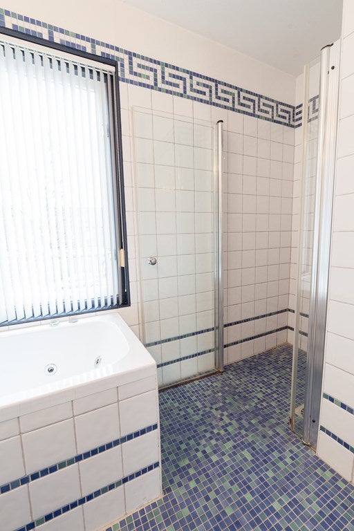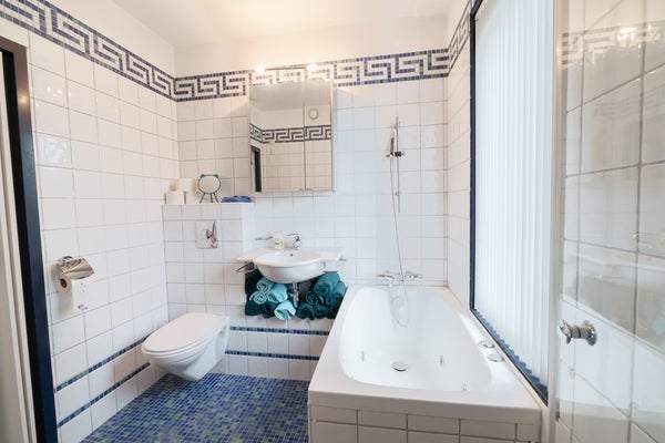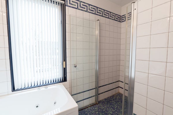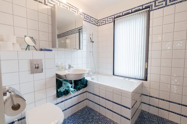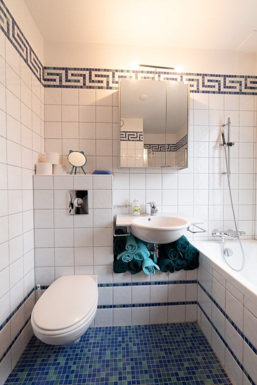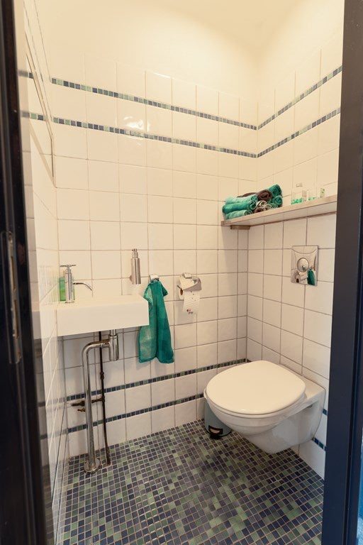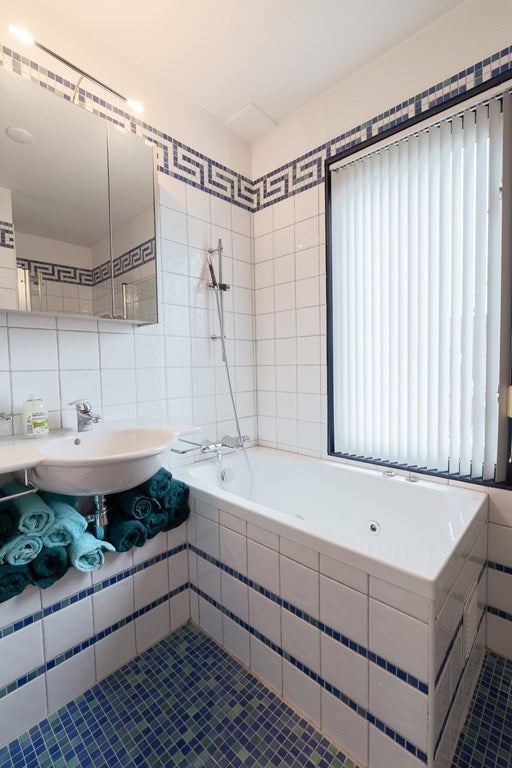 De badkamer is functioneel ingericht en beschikt over een zitbad — ideaal voor gezinnen met kleine kinderen — een aparte douchecabine, een wastafel en een tweede (hangend) toilet. Op de overloop is een vaste kastruimte gecreëerd waarin de technische installaties slim zijn weggewerkt. Hier treft u de warmtewisselaar en de convector voor de luchtverwarming aan, evenals de CV-ketel die zeer recent (november 2024) is vernieuwd.