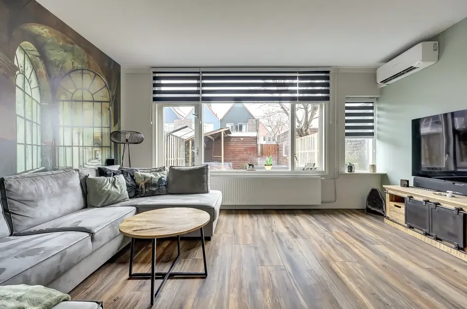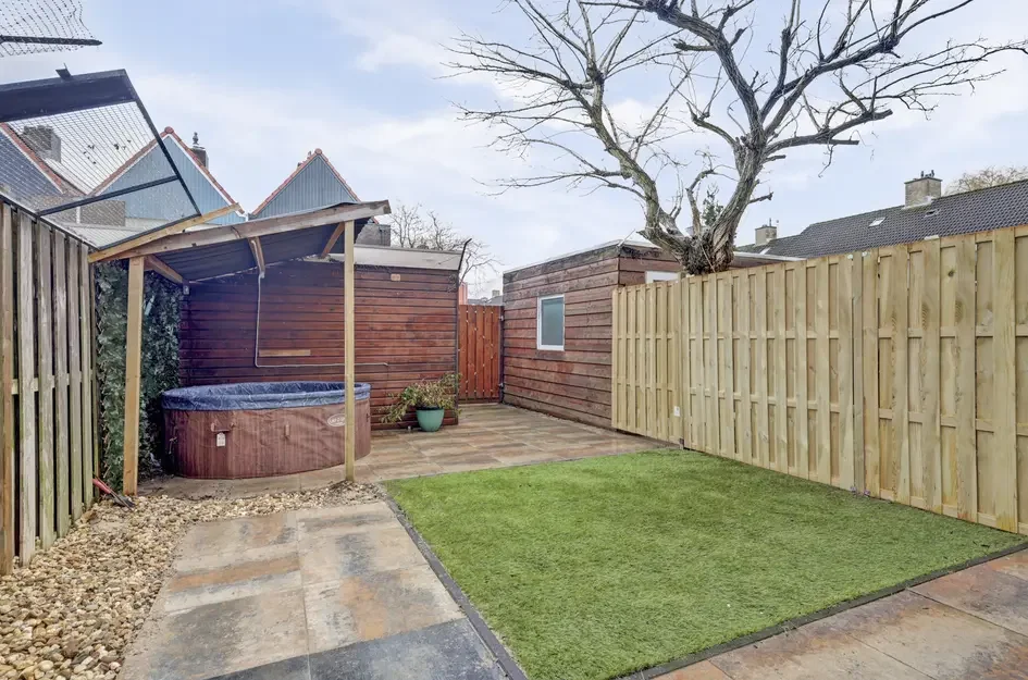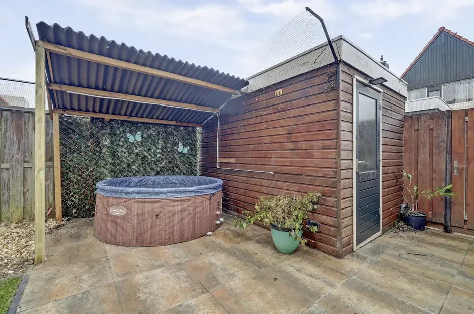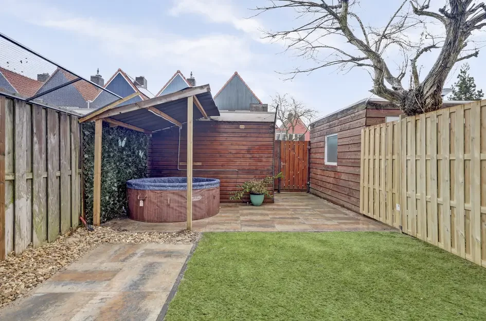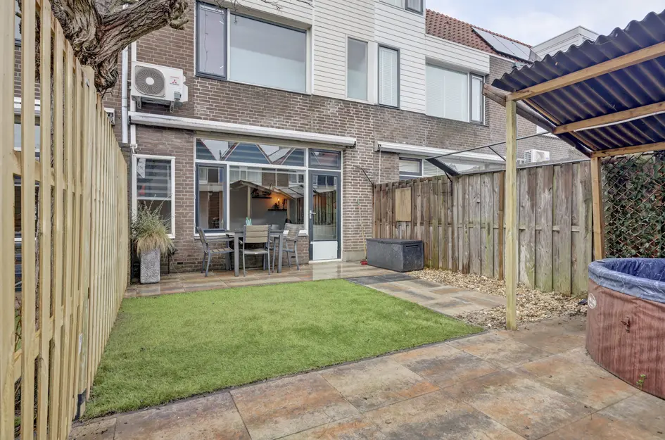 Achter de woning ligt een fijne tuin met terras en houten berging. De woning heeft energielabel C, de CV-ketel is van 2019, en er zijn 10 zonnepanelen geïnstalleerd.