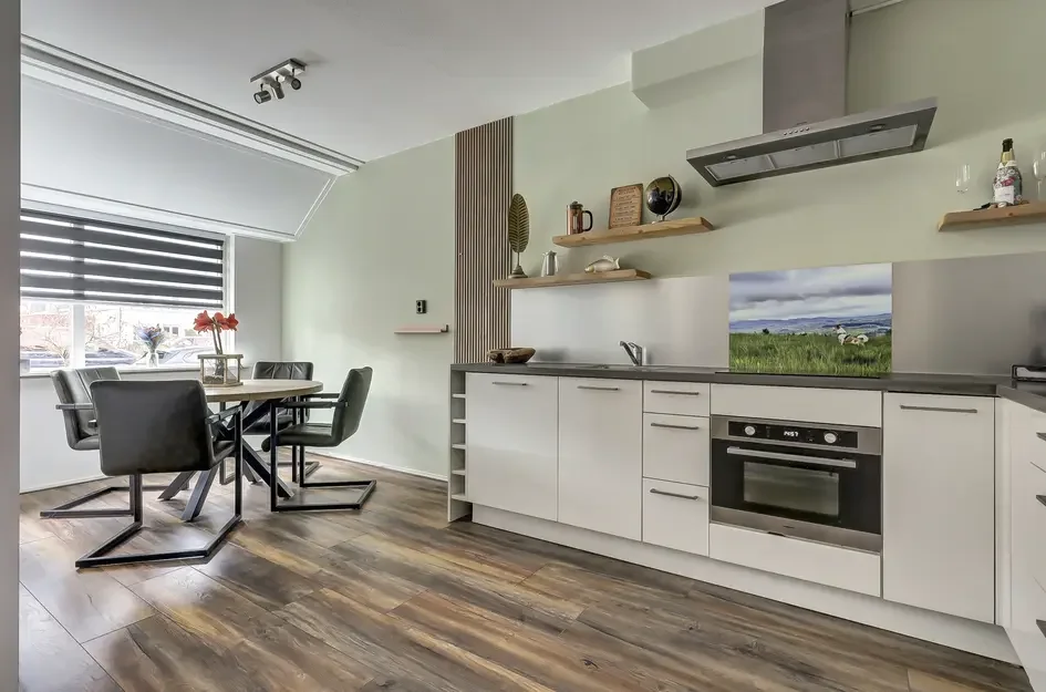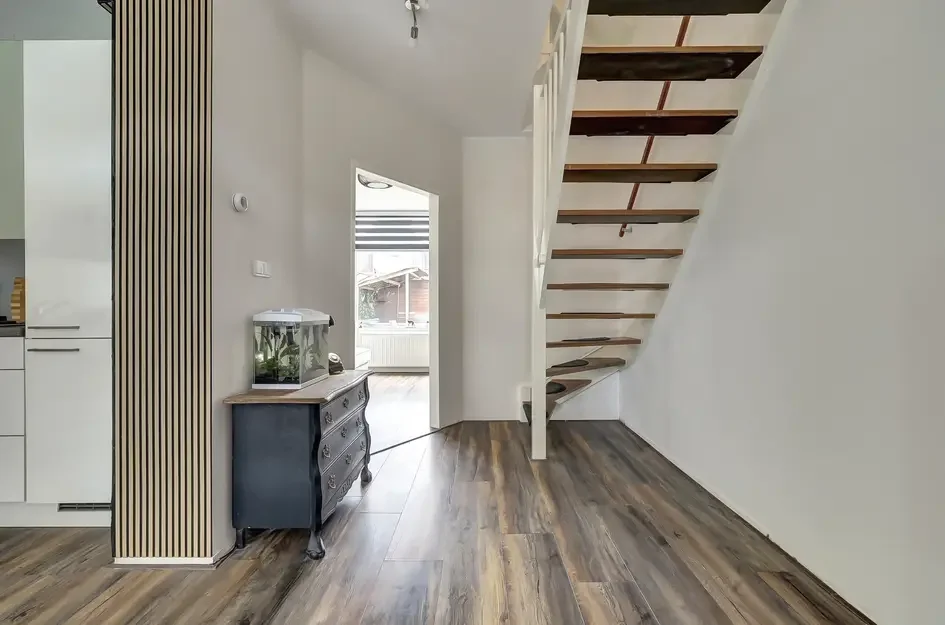 Deze fijne tussenwoning met een gebruiksoppervlakte van 125 m² en vier slaapkamers ligt op korte afstand van scholen, winkels en sportfaciliteiten. De indeling begint op de begane grond met een entree die toegang biedt tot een betegelde toiletruimte en een ruime, lichte woonkeuken, voorzien van inbouwapparatuur zoals een inductiekookplaat, vaatwasser en combi-oven. De sfeervolle woonkamer met tuindeur is aan de tuinzijde gelegen.