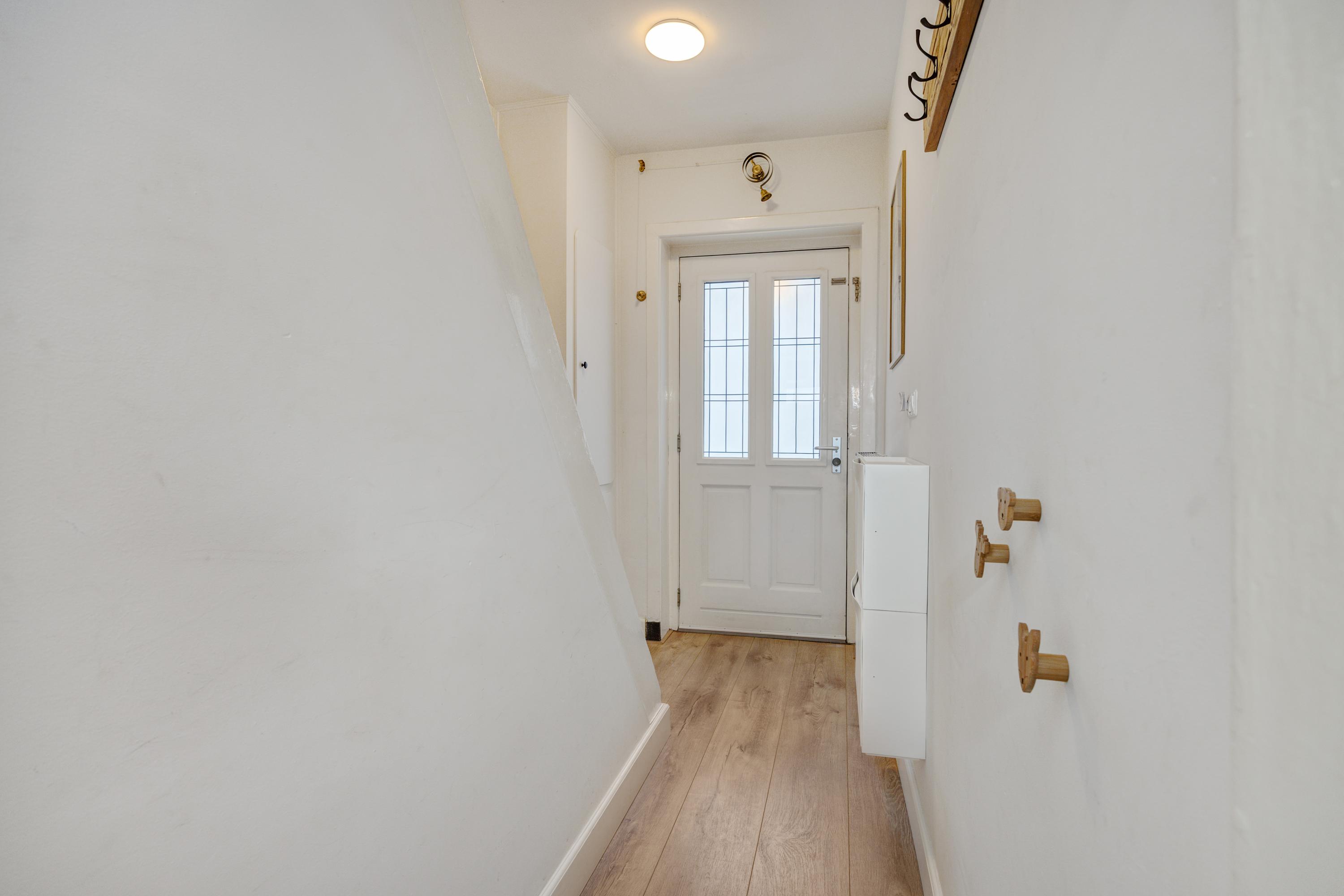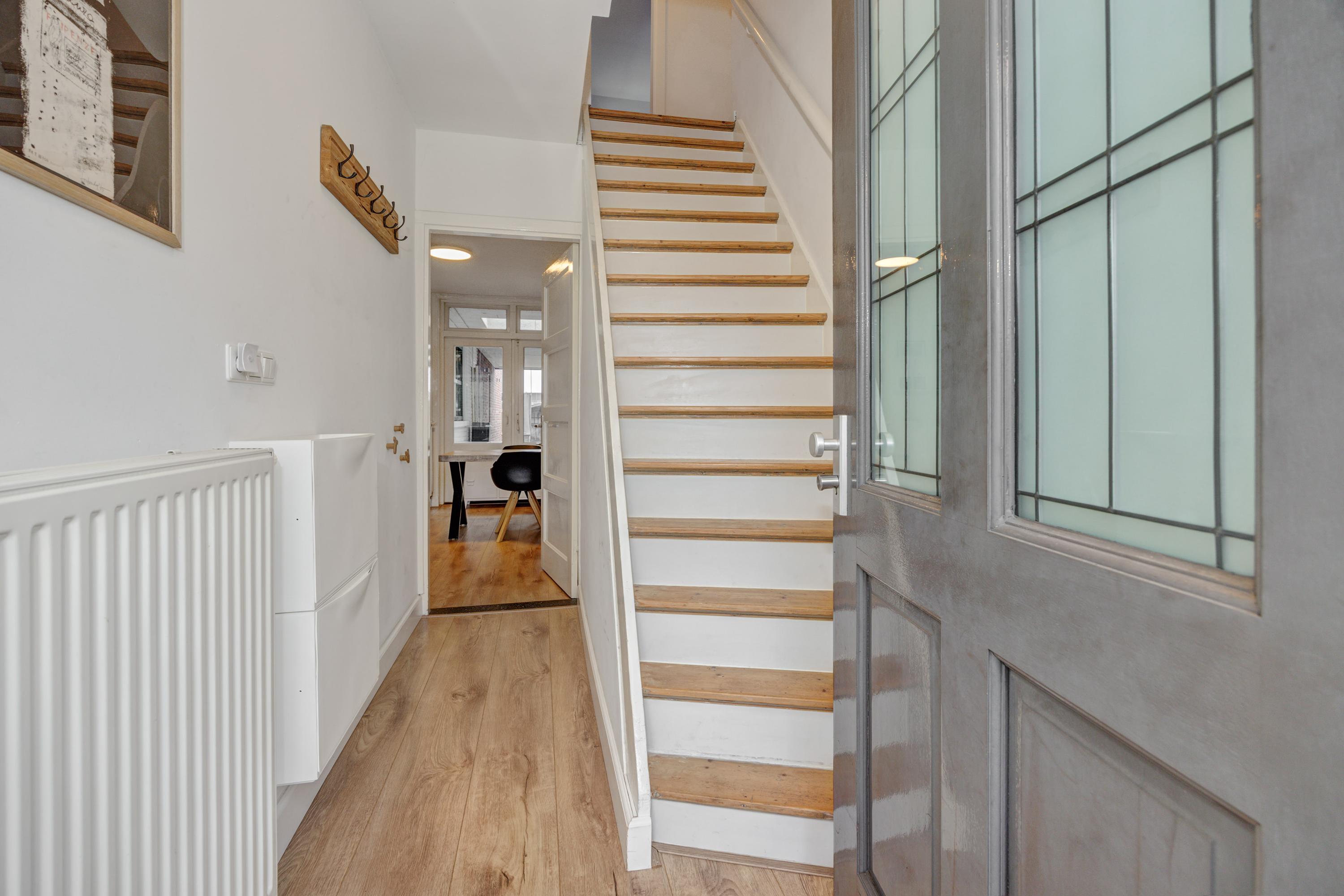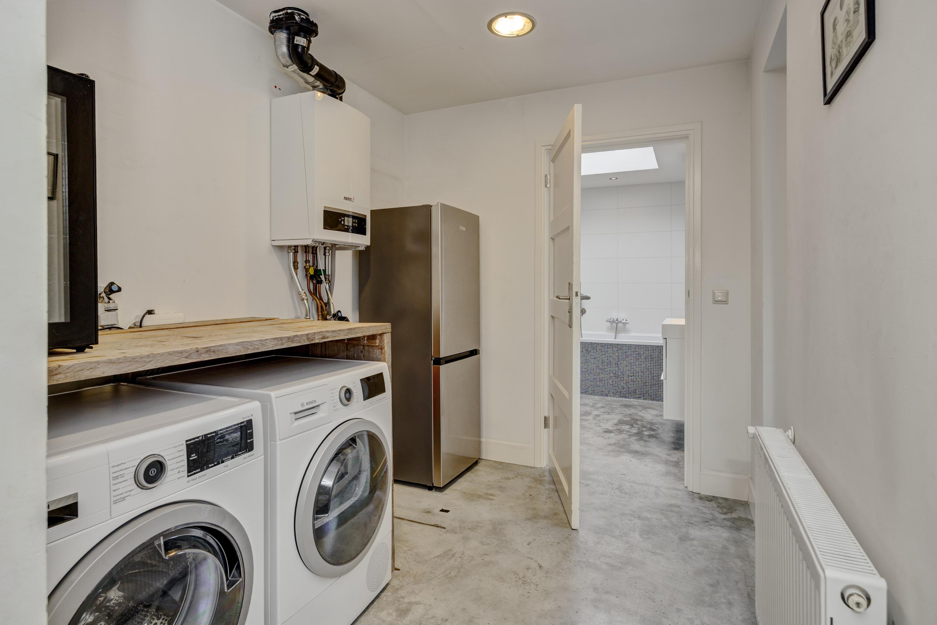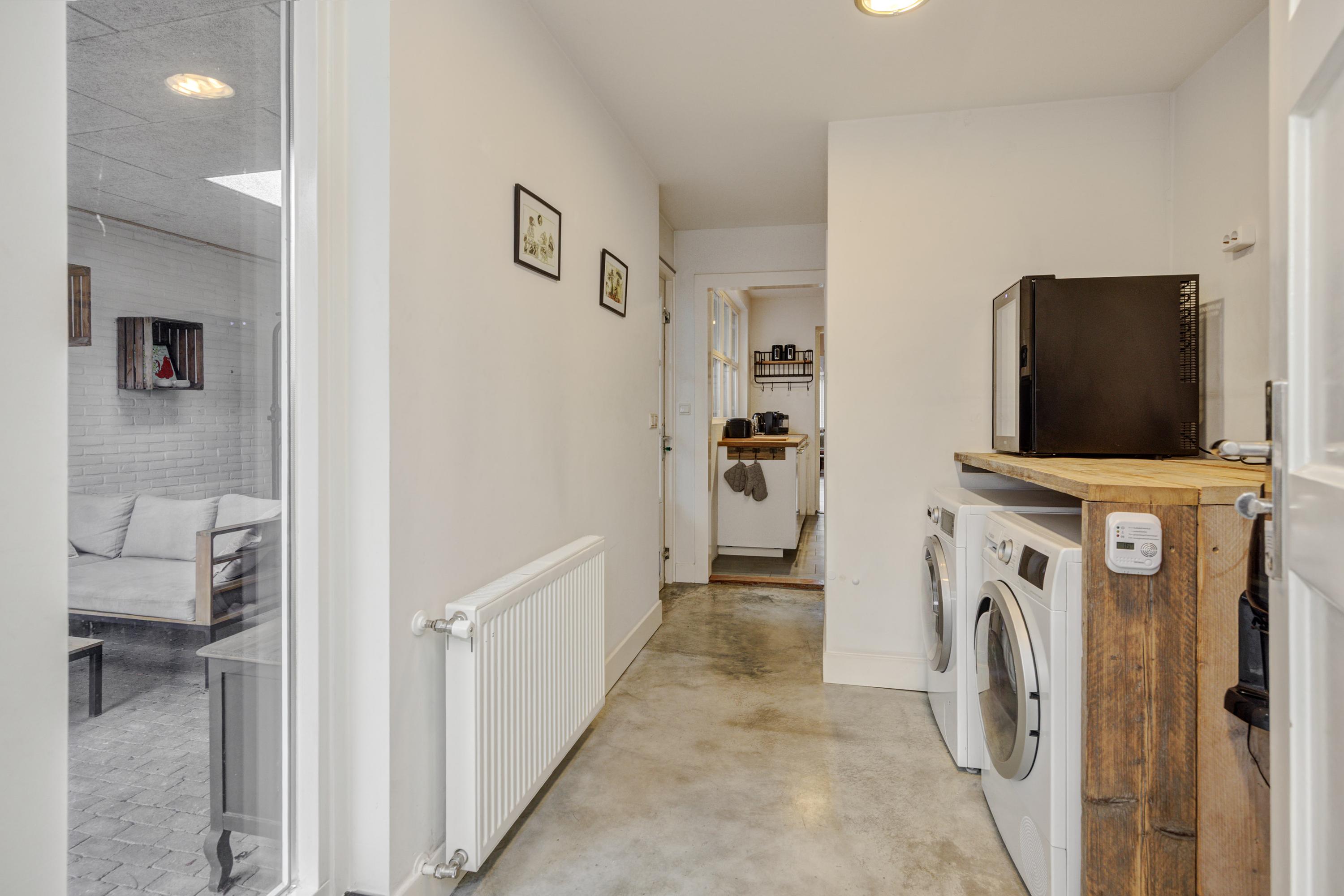Binnenkomend vindt u een hal met garderobe en trapopgang. De leefruimte met erker en grote eettafel biedt uitzicht op de achtertuin. De keuken, uitgerust met moderne apparatuur, kijkt ook uit op de tuin. Een grote bijkeuken met aansluitingen voor de wasmachine en toilet maakt het geheel compleet. De lichte badkamer op de begane grond heeft een ligbad, douche en wastafel.