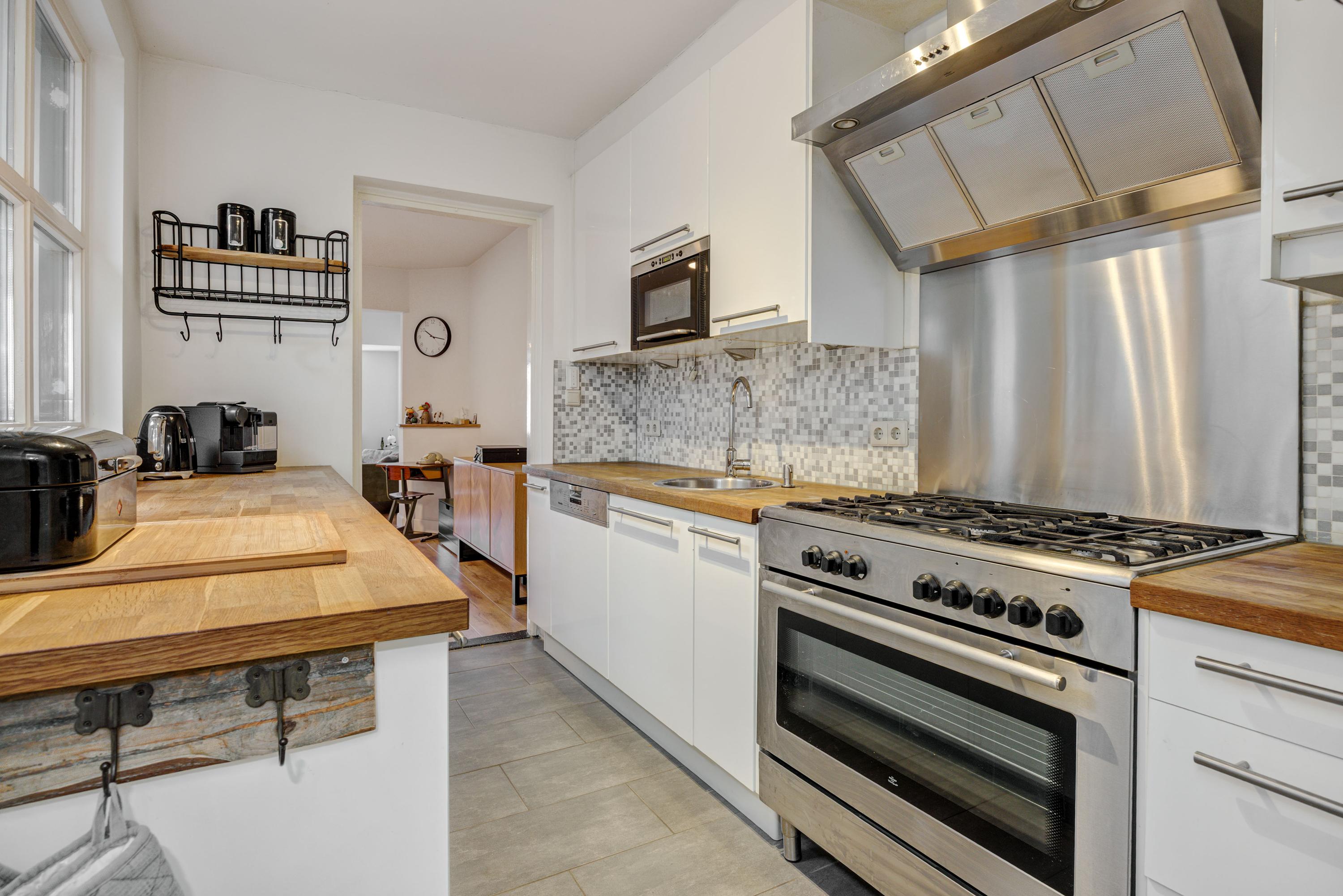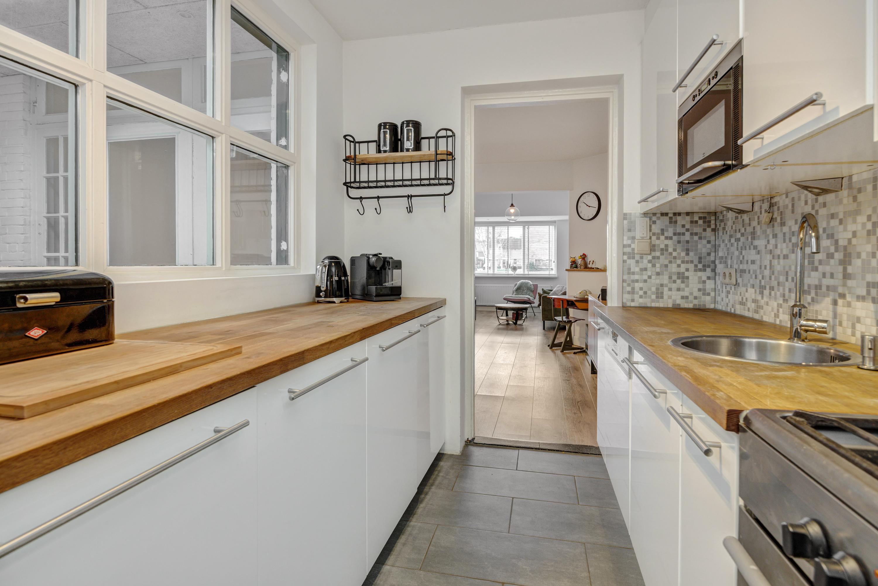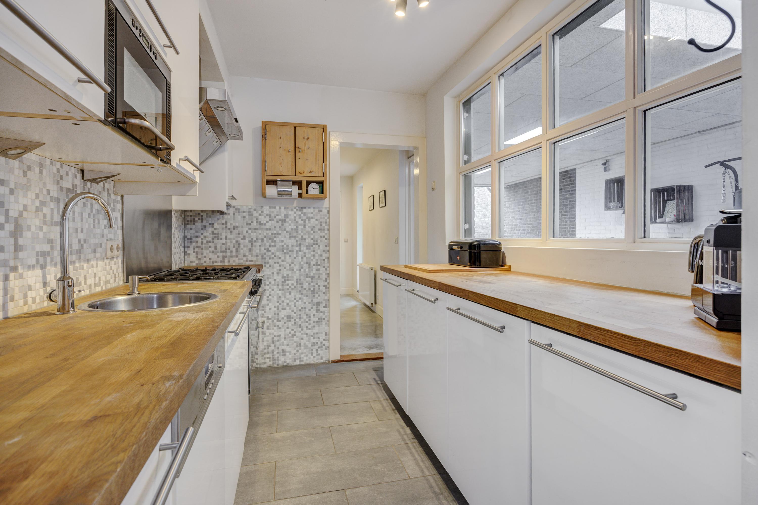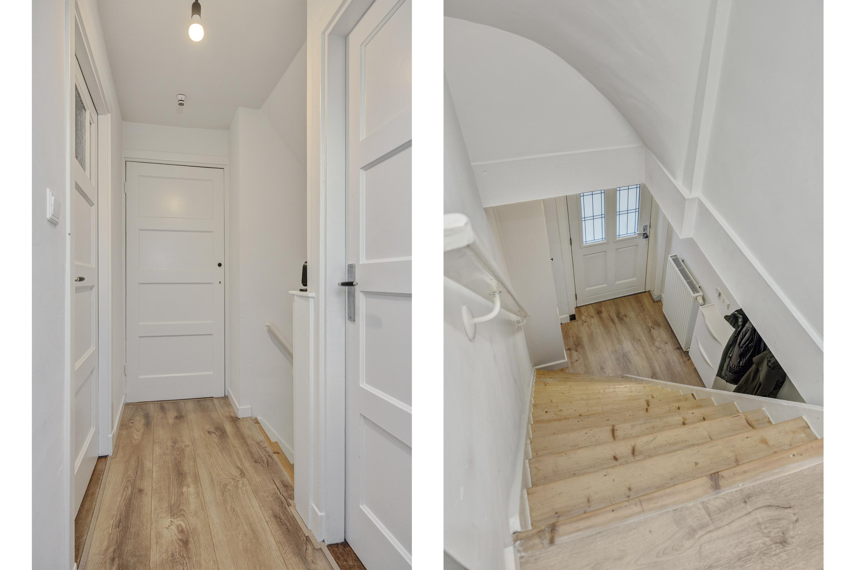 Binnenkomend vindt u een hal met garderobe en trapopgang. De leefruimte met erker en grote eettafel biedt uitzicht op de achtertuin. De keuken, uitgerust met moderne apparatuur, kijkt ook uit op de tuin. Een grote bijkeuken met aansluitingen voor de wasmachine en toilet maakt het geheel compleet. De lichte badkamer op de begane grond heeft een ligbad, douche en wastafel.
