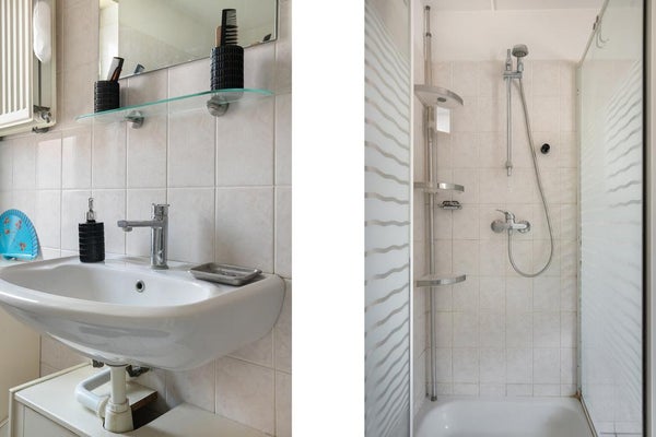 De badkamer is aan de voorzijde gesitueerd, in lichte tinten uitgevoerd en voorzien van een vaste wastafel + planchet + kastje, douchecabine en tevens de aansluitmogelijkheid tot 2e toilet en ligbad. Een keurig geheel!