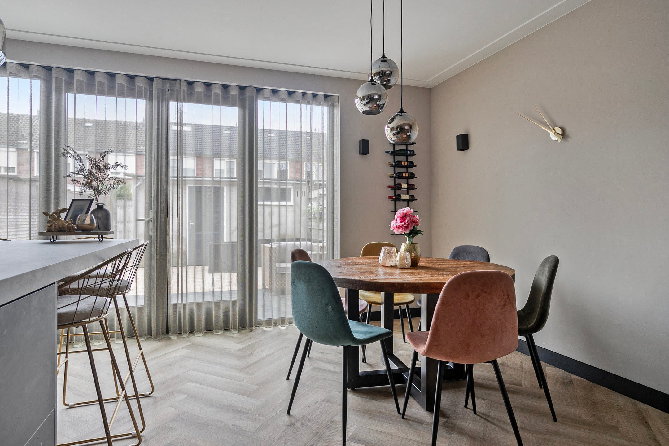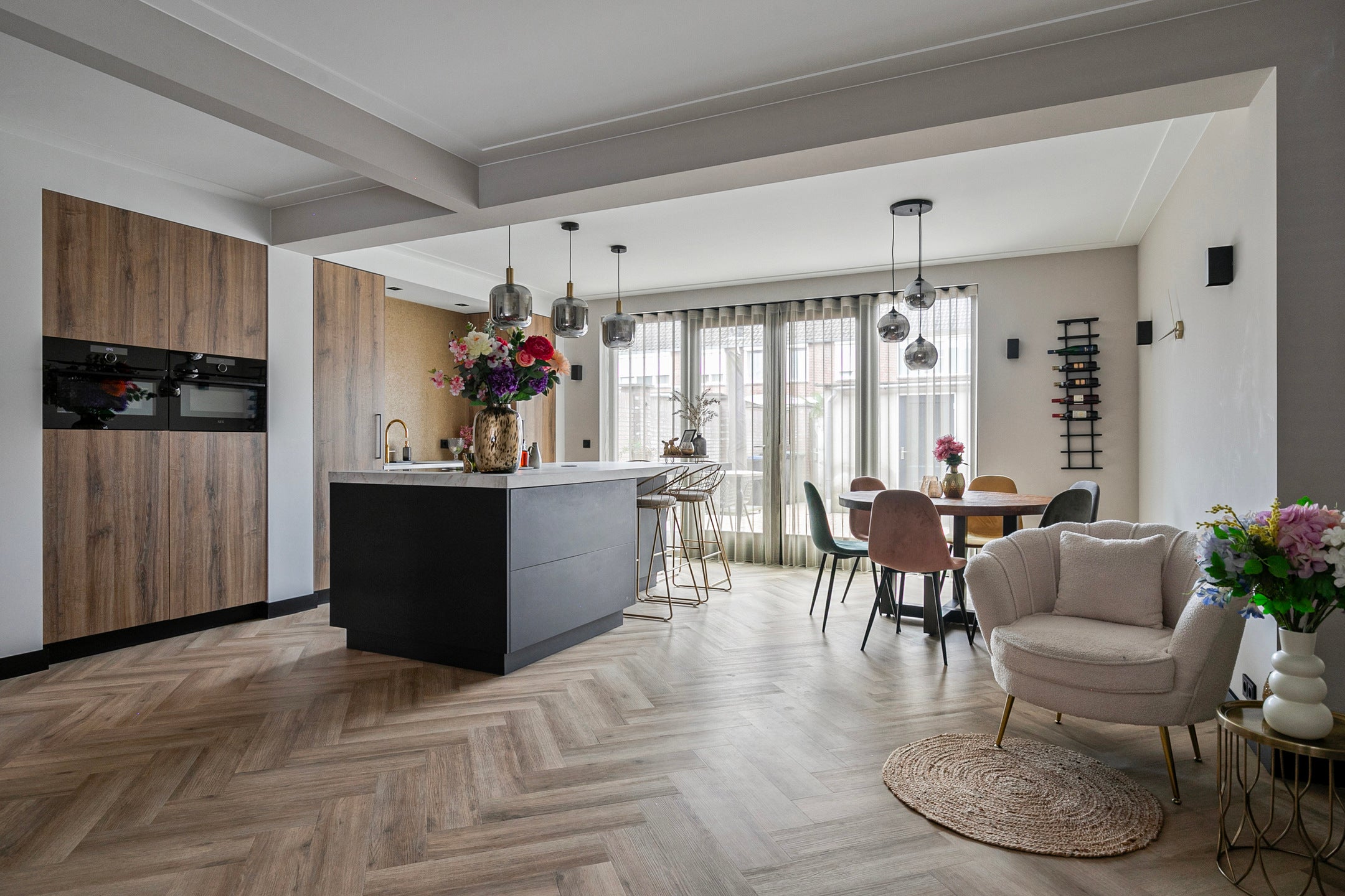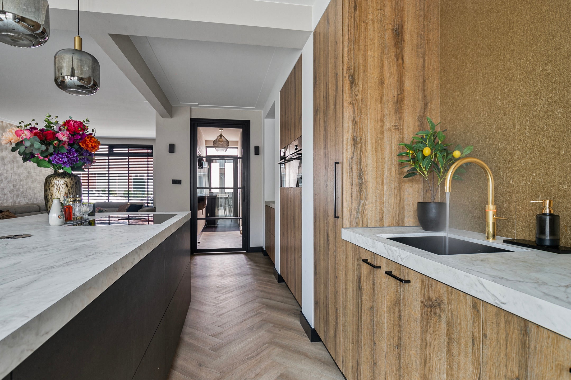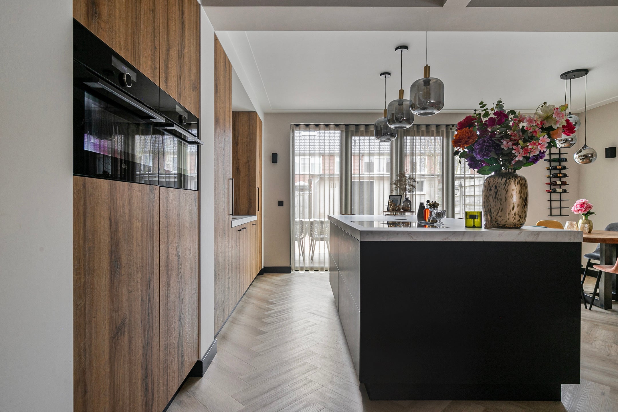 Deze over de volle breedte uitgebouwde tussenwoning aan de Kruisbekstraat 29 in Helmond is verrassend ruim. De uitbouw biedt ruimte voor een schitterende keuken met een kookeiland en een sfeervolle open indeling. De begane grond heeft een ruime ontvangsthal, een lichte woonkamer met grote ramen en openslaande deuren naar de tuin. De moderne keuken is volledig uitgerust met diverse inbouwapparatuur.