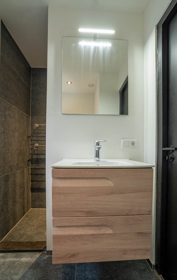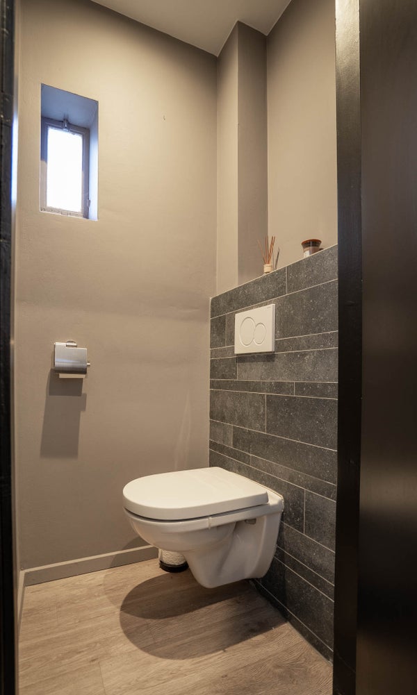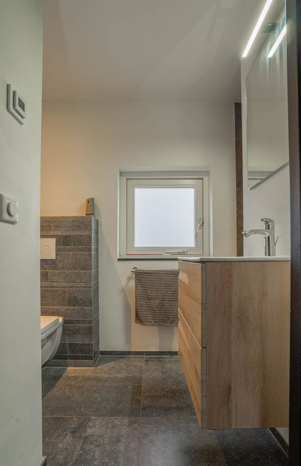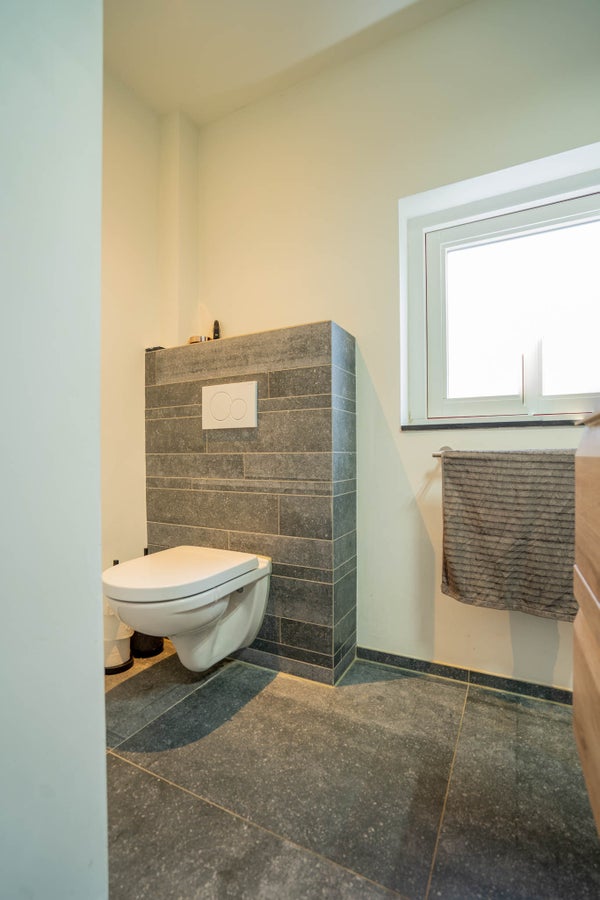 De modern ingedeelde badkamer is deels betegeld en deels gestuukt, met elektrische vloerverwarming en een raam voor natuurlijke ventilatie. Alles is keurig netjes onderhouden. Voorzien van inloopdouche, wastafel en toilet.