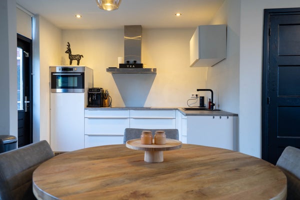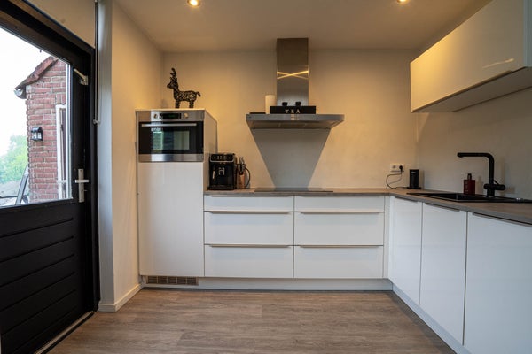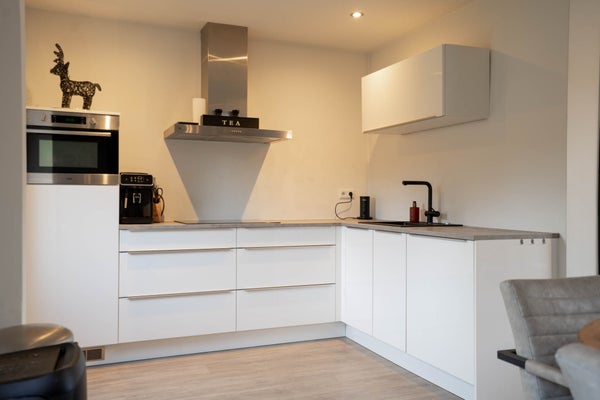 De open, L-vormige keuken sluit perfect aan op de woonkamer. Ook hier treft u een pvc vloer met vloerverwarming en gestuukte wanden en plafonds. De moderne, strakke keuken is voorzien van een koelkast, vaatwasser, combi-magnetron, inductiekookplaat en combi-oven. Via de loopdeur staat u zó in de tuin.