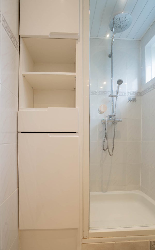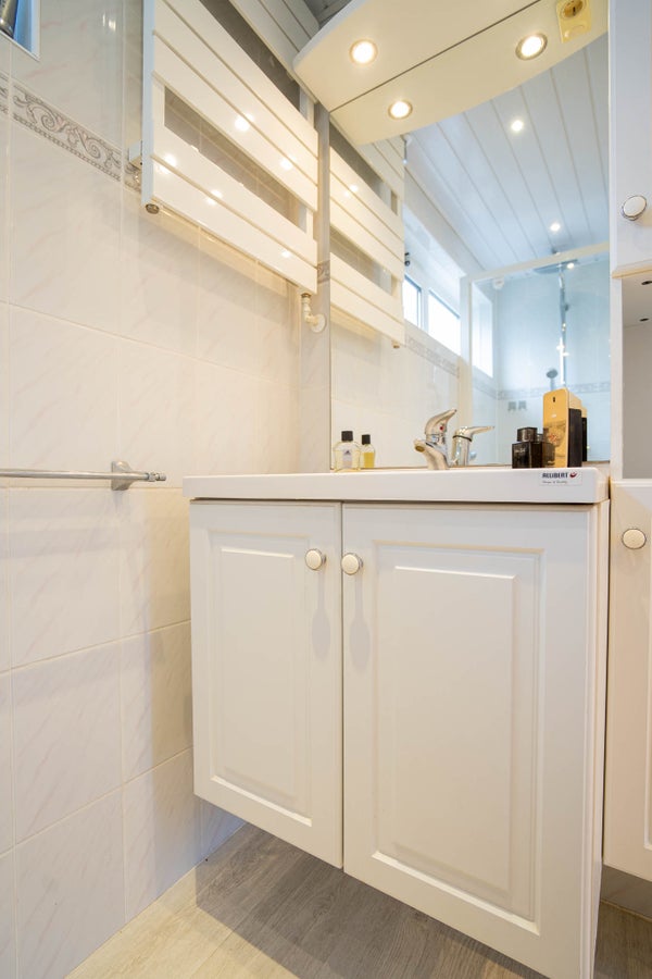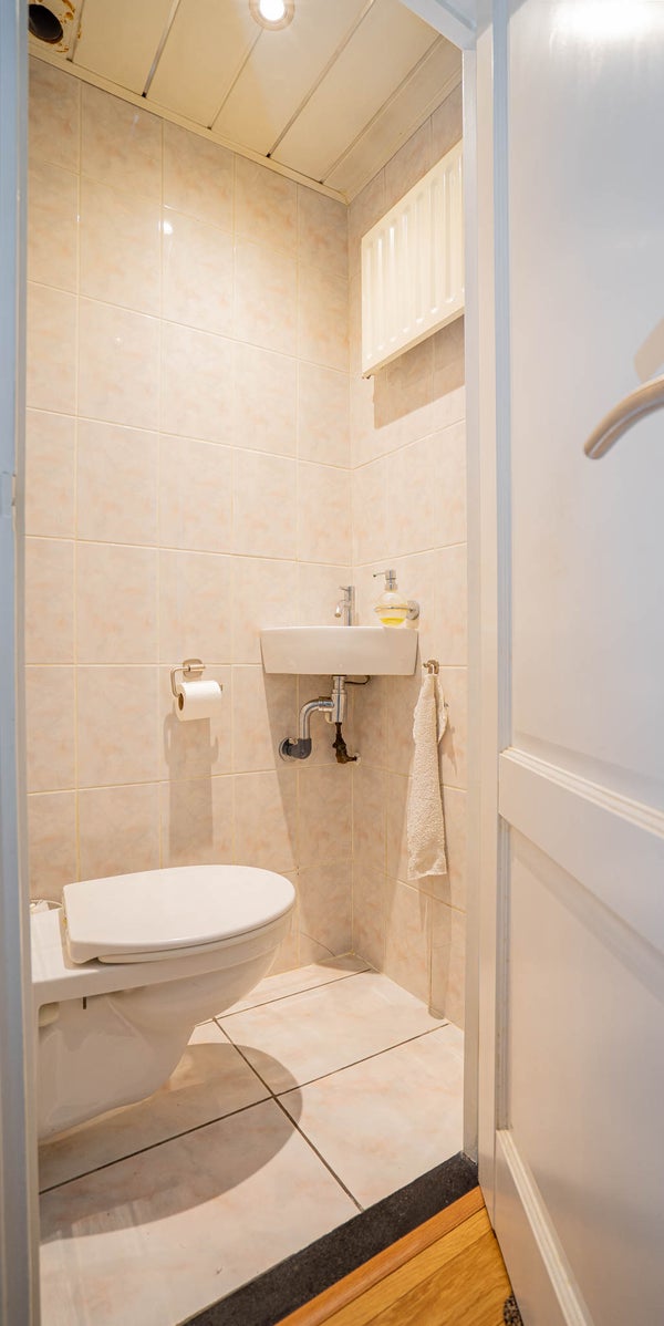 De badkamer is volledig betegeld en keurig onderhouden. U beschikt hier over een wastafel met meubel en een inloopdouche met regendouche. Het aanwezige raam is ideaal voor natuurlijke ventilatie; het plafond is uitgevoerd met schrootjes.