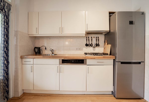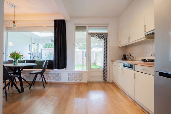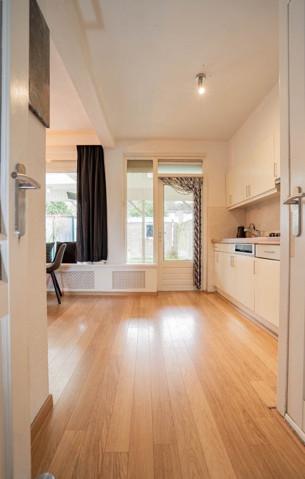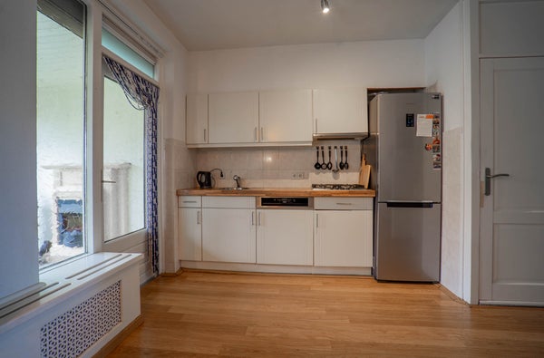 De keuken betreft een rechte open keuken, netjes bijgehouden en heerlijk licht. Via de tuindeur stapt u zo naar buiten. Extra praktisch is de handige trapkast voor extra bergruimte.