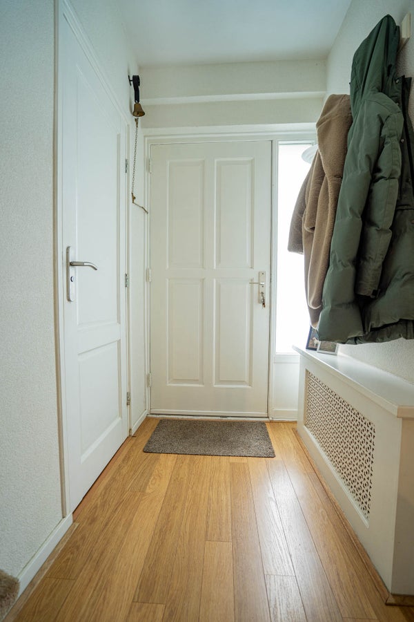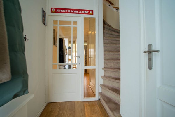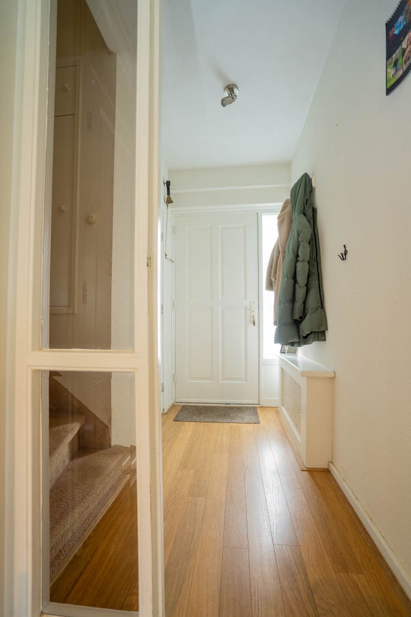 U komt binnen in de hal, een fijne entree met een laminaatvloer en gestuukte wanden en plafond. Vanuit hier bereikt u de toiletruimte, de trapopgang naar de verdieping en de keuken.