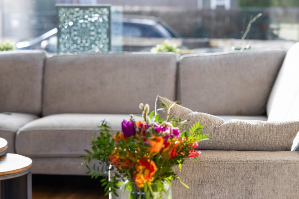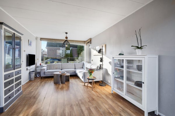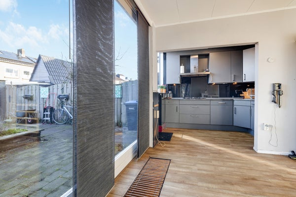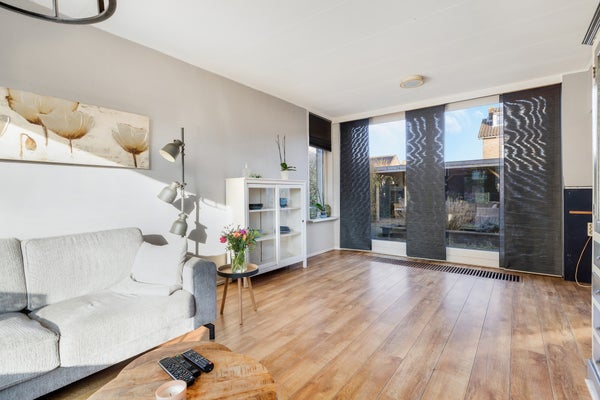 De woonkamer is opvallend ruim en licht, met een plafondhoogte van circa 2,60 meter en grote raampartijen aan de achterzijde. Hier is meer dan genoeg ruimte voor een royale zithoek en een grote eettafel. De open indeling zorgt voor een prettige verbinding met de keuken.