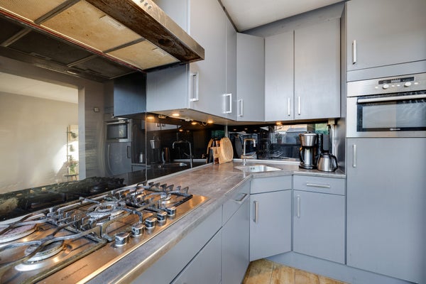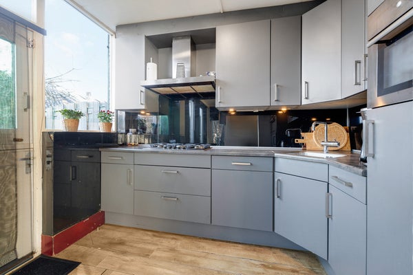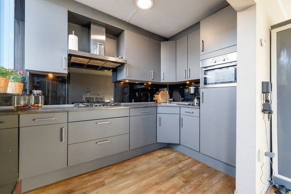 De keuken bevindt zich aan de achterzijde van de woning en is praktisch ingericht met een rechte opstelling en voldoende kastruimte en werkblad.