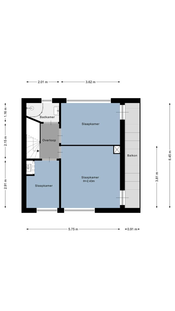 De slaapkamers hebben een plafondhoogte van circa 2,43 meter en zijn praktisch indeelbaar.