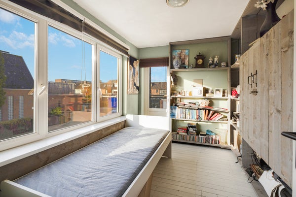 Slaapkamer 3 – aan de voorzijde, perfect als logeer- of studeerkamer, met toegang tot het balkon.
