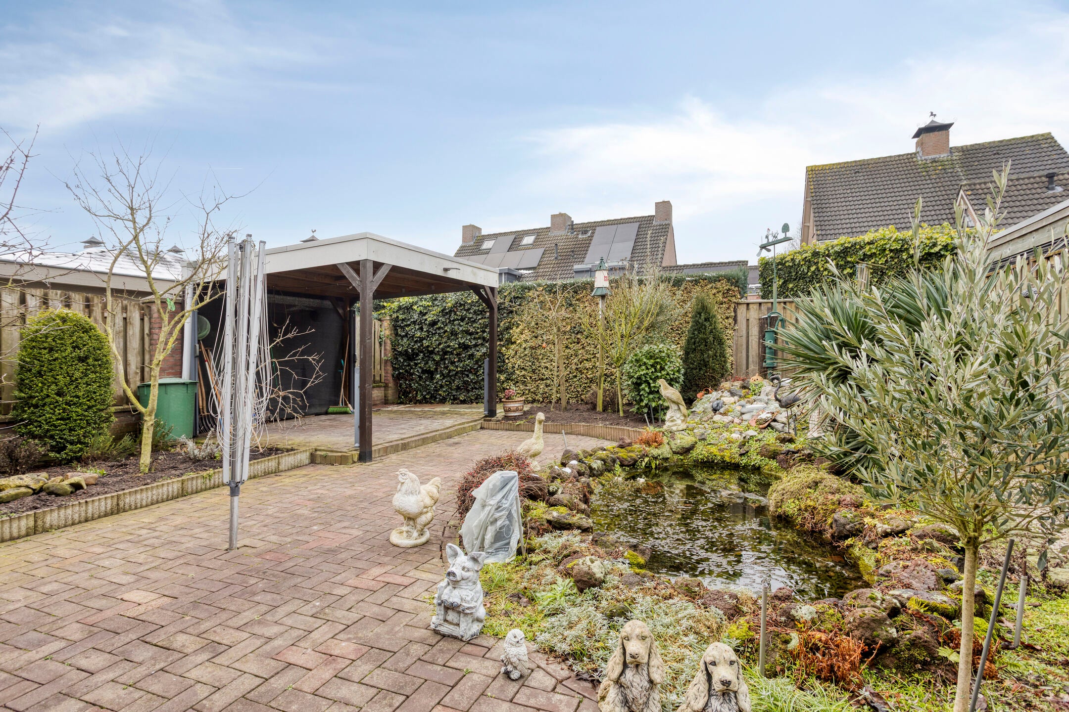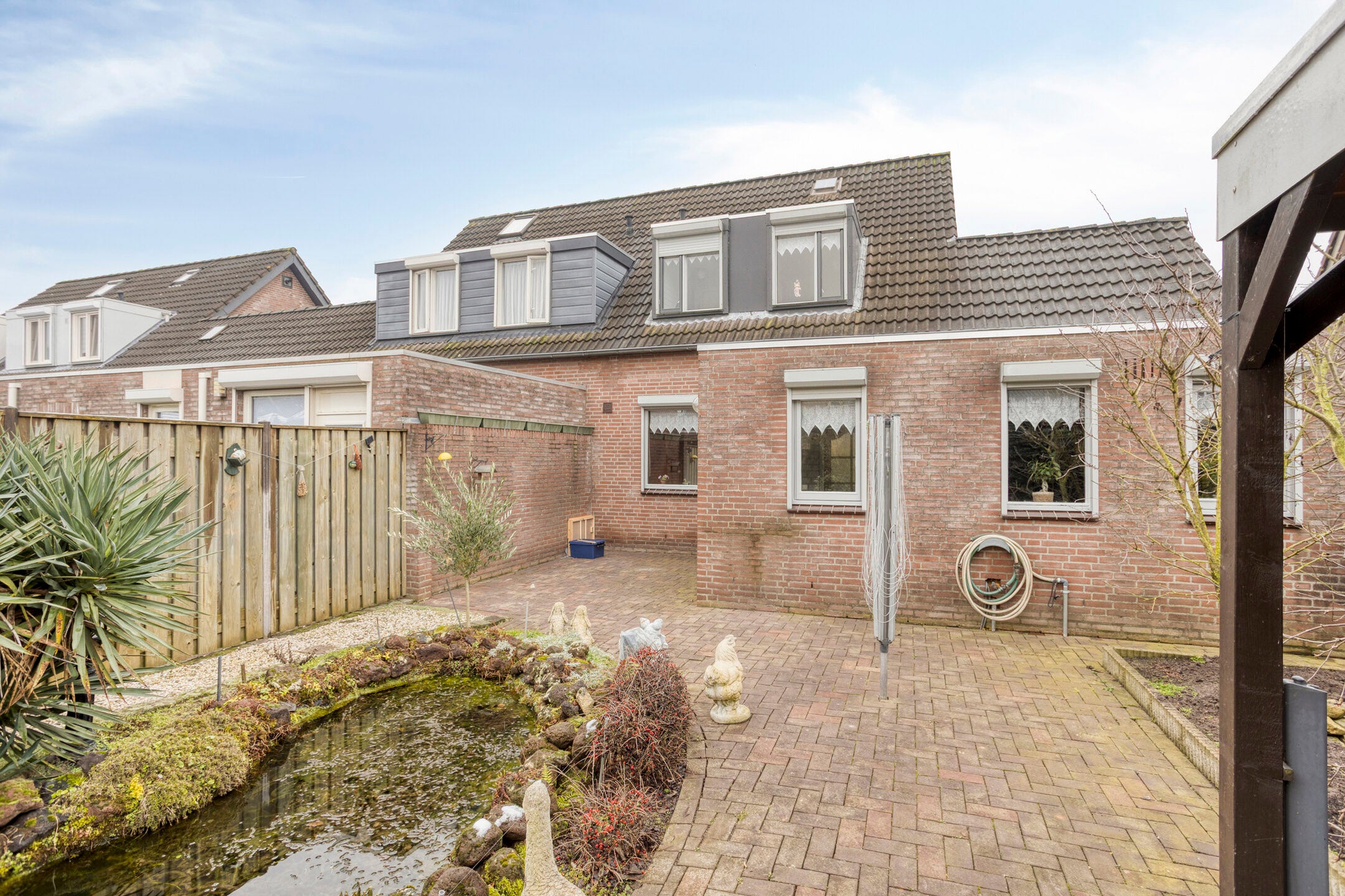 In het rustige Herpen bevindt zich deze 2-onder-1-kapwoning met een carport, garage en een verzorgde tuin met vijver. Bij binnenkomst komt u in een hal met toilet en meterkast. De lichte woonkamer heeft een provisiekast en een open keuken met eiken keukeninrichting, inclusief koelkast, gaskookplaat en oven. Via de bijkeuken zijn de witgoedaansluitingen te vinden. De garage met vliering biedt extra bergruimte. Op de eerste verdieping zijn drie slaapkamers, allen met dakkapel, en een badkamer met douche, toilet en wastafel. De zolderberging is bereikbaar via een vlizotrap. Deze woning heeft een woonoppervlakte van 87 m², staat op een perceel van 245 m² en heeft energielabel C.