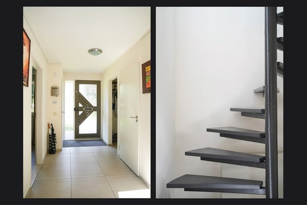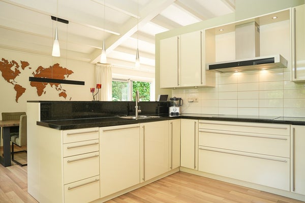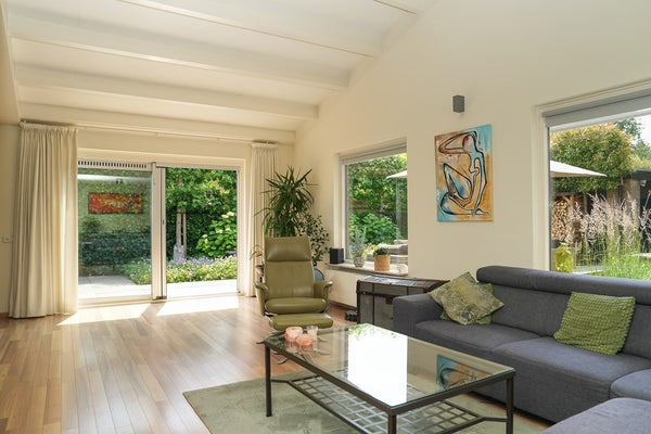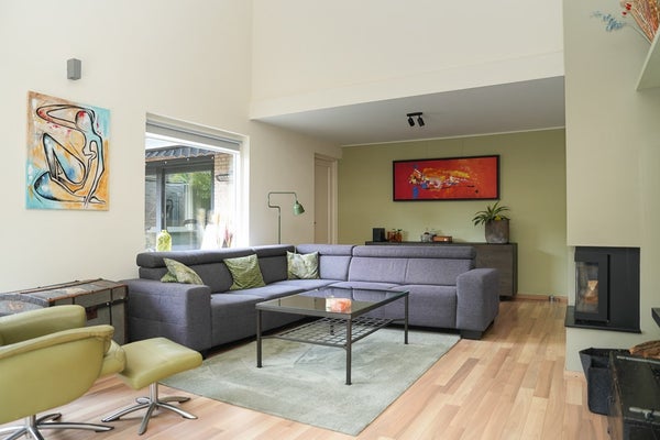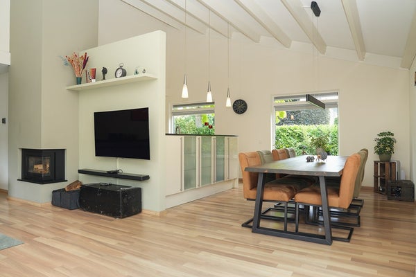 In de hal vinden we de meterkast en een nette toiletruimte. Vanuit de hal heb je toegang tot de lichte woonkamer met open haard en grote raampartijen met zicht op het groen. De woonkamer grenst aan een sfeervolle eethoek en de open keuken, voorzien van onder meer een inductiekookplaat, afzuigkap, combi-oven, koelkast, vriezer, vaatwasser én een Quooker (2020). Hierachter is er een praktische bijkeuken met achterdeur.