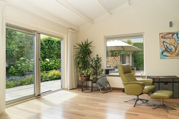 Naast de woonkamer bevindt zich een slaapkamer, deze is nu in gebruik als een sportkamer, maar zou ook goed als werkkamer kunnen functioneren. Deze ruimte heeft een schuifpui naar de tuin. Deze kamer is uitgerust met infraroodpanelen en biedt veel flexibiliteit qua gebruik.