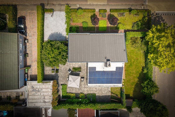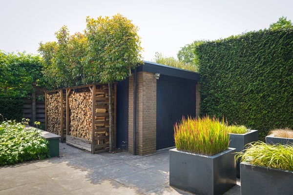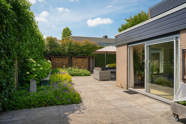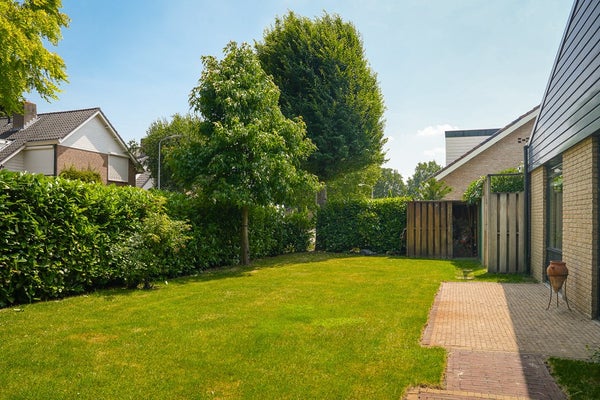 De tuin is schitterend aangelegd. Aan de voorzijde is het groen netjes onderhouden en voorzien van fraaie tuinverlichting. Aan de zijkant is een afsluitbare oprit met grind en hek. Achter de woning ligt een strak vormgegeven tuin met groot terras, borders met vaste planten, een houtopslag en diverse zithoeken.
