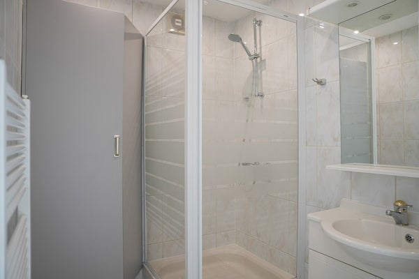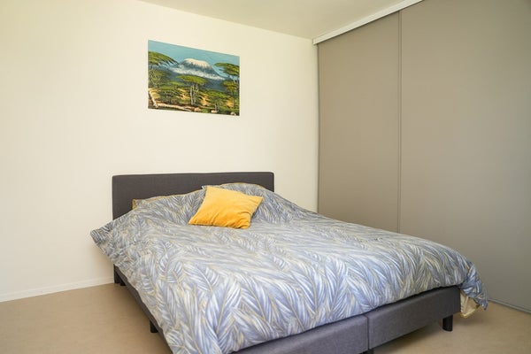 Dan is er een tweede ruime slaapkamer op de begane grond, met daar tegenover een eigen badkamer. Deze ruimte is voorzien van een praktische kastenwand over de breedte.
