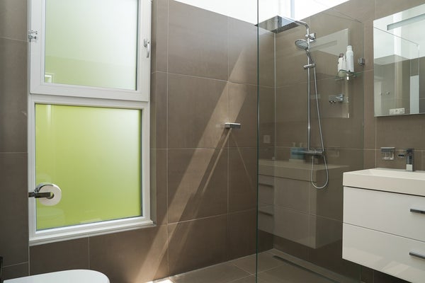 De badkamer is modern en comfortabel, voorzien van een ruime inloopdouche, wastafelmeubel, tweede toilet en vloerverwarming. De hoogte en het hoog geplaatste raam zorgen voor veel daglicht.