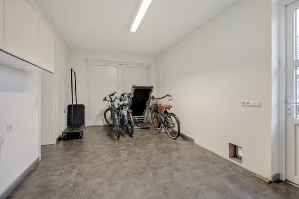 Vanaf de hal is de inpandige garage gemakkelijk bereikbaar. De garage is voorzien van vloerverwarming. Daarnaast beschikt de ruimte over aansluitingen voor de wasmachine en is hier de bodem-water warmtepomp aangesloten, wat bijdraagt aan een energiezuinige woning. De garage biedt voldoende ruimte om fietsen te stallen en spullen op te bergen.