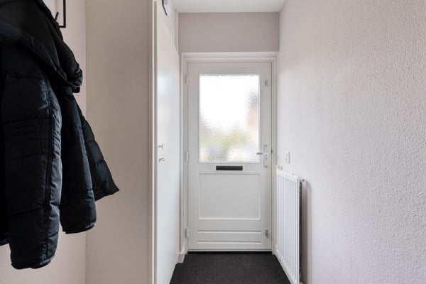 In de hal bevinden zich de trapopgang naar de eerste verdieping en de meterkast. Vanuit de hal heeft u toegang tot de woonkamer.