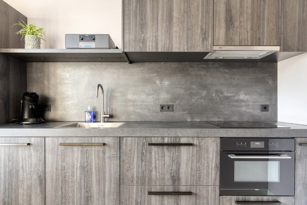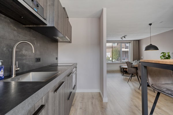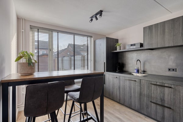 De keuken ligt aan de tuinzijde. Hier vindt u een op maat gemaakte keukeninrichting die in een lengteopstelling is geplaatst. De keukeninrichting is uitgevoerd in een grijze tint en heeft de uitstraling van hout. In het composiet aanrechtblad bevinden zich een spoelbak en een 4-pits inductiekookplaat. De overige apparatuur bestaat uit een koel/vriescombinatie, een magnetron/oven en een afzuigkap. Er zijn onder- en boven kastjes. Extra bergruimte vindt u in de kast die zich onder de trap bevindt.