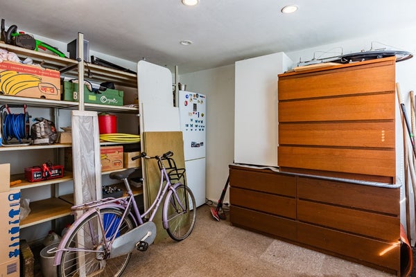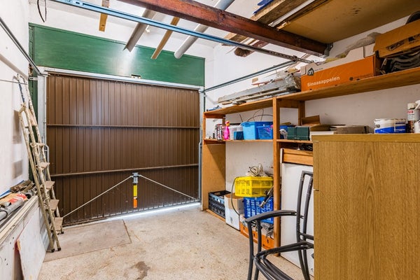 Achter de woning is overdwars een extra ruime garage gelegen. Momenteel is de garage in twee delen gedeeld met een lichte tussenwand, maar deze kan er eventueel ook zeer eenvoudig tussenuit. Dan zou de garage weer één geheel zijn. Bijzonder is dat het voorste del van de garage extra hoogte kent. Het plafond is hier bijna 3 meter hoog. Het achterste deel heeft meer een standaard hoogte. Op zich vermeldenswaardig en een bijzonder detail is dat in het verleden deze garage zelfs de buurtsuper voor de wijk Elsbroek betrof. In plaats van de garageklep was er een pui en loopdeur aanwezig en op het perceel stond de SRV-wagen. Voorts is er vanzelfsprekend stroom en is er thans ook bedraad internet aanwezig. Kortom, deze ruimte is multifunctioneel te gebruiken.