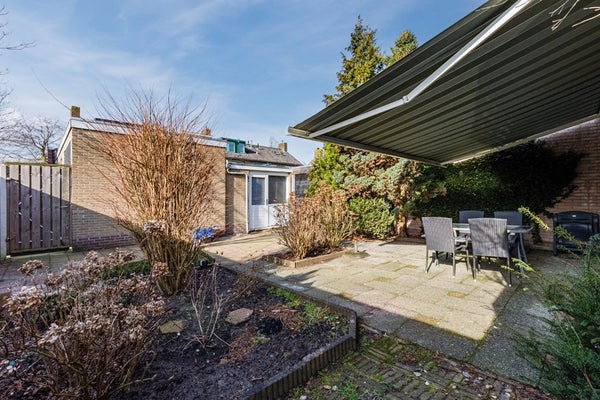 Doordat de woonkamer met open keuken grote ramen aan drie zijden heeft, betreft het een enorm lichte ruimte. De centraal gelegen houtkachel geeft vanzelfsprekend extra sfeer, maar kan ook nog eens flink besparen op energiekosten. Openslaande deuren aan de achterzijde bieden toegang tot de ruime achtertuin met een zonligging op het zuidwesten. Gedurende de gehele dag heeft u hier vele mogelijkheden om van de zon te genieten, maar er is ook altijd wel een plekje in de schaduw te vinden. Daarnaast is er een groot elektrisch zonnescherm die een grote overkapping biedt over de gehele breedte van de woning.
