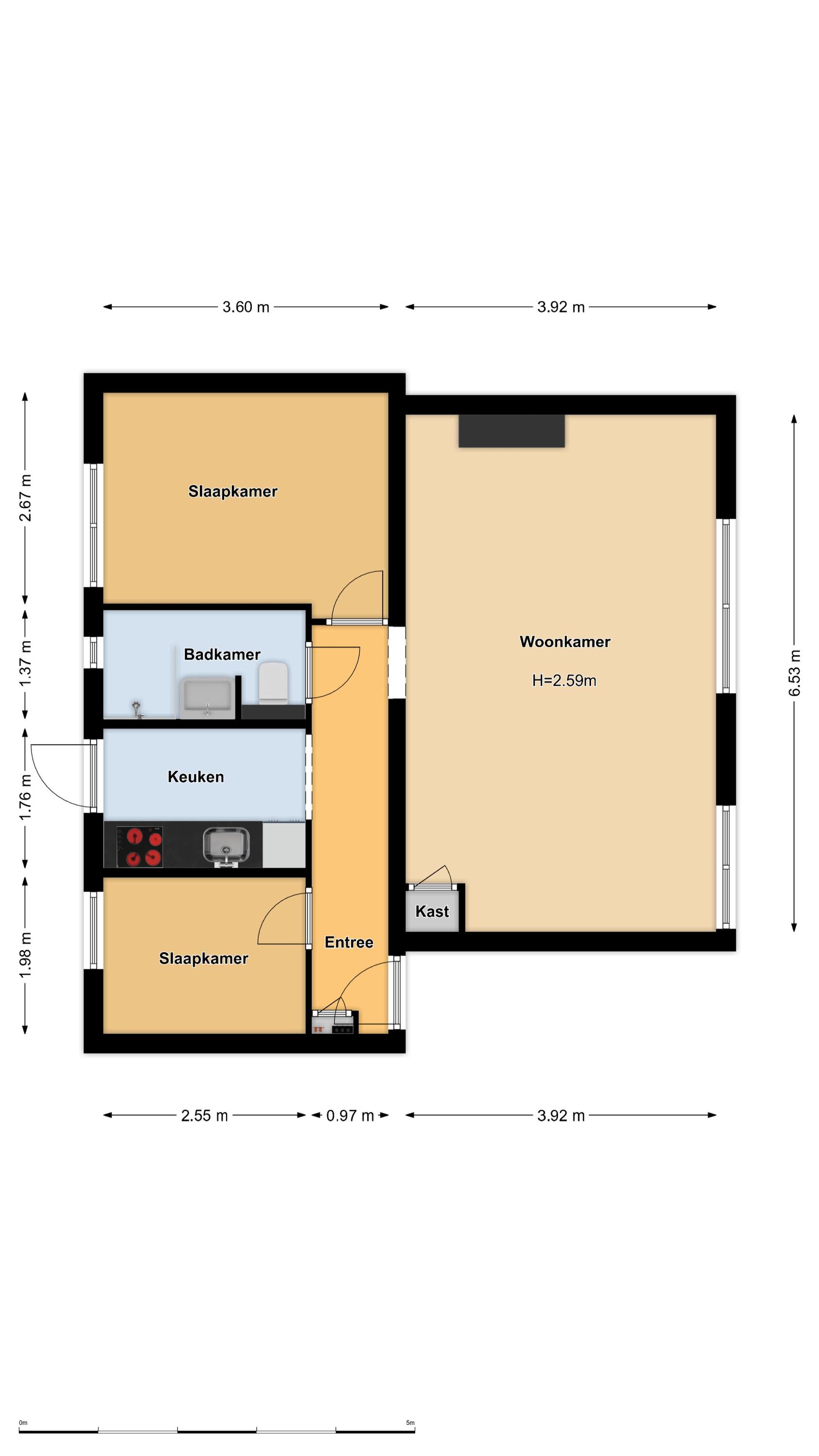- De tussenwoning heeft een woonoppervlakte van 56 m² en beschikt over 3 kamers, waarvan 2 slaapkamers;