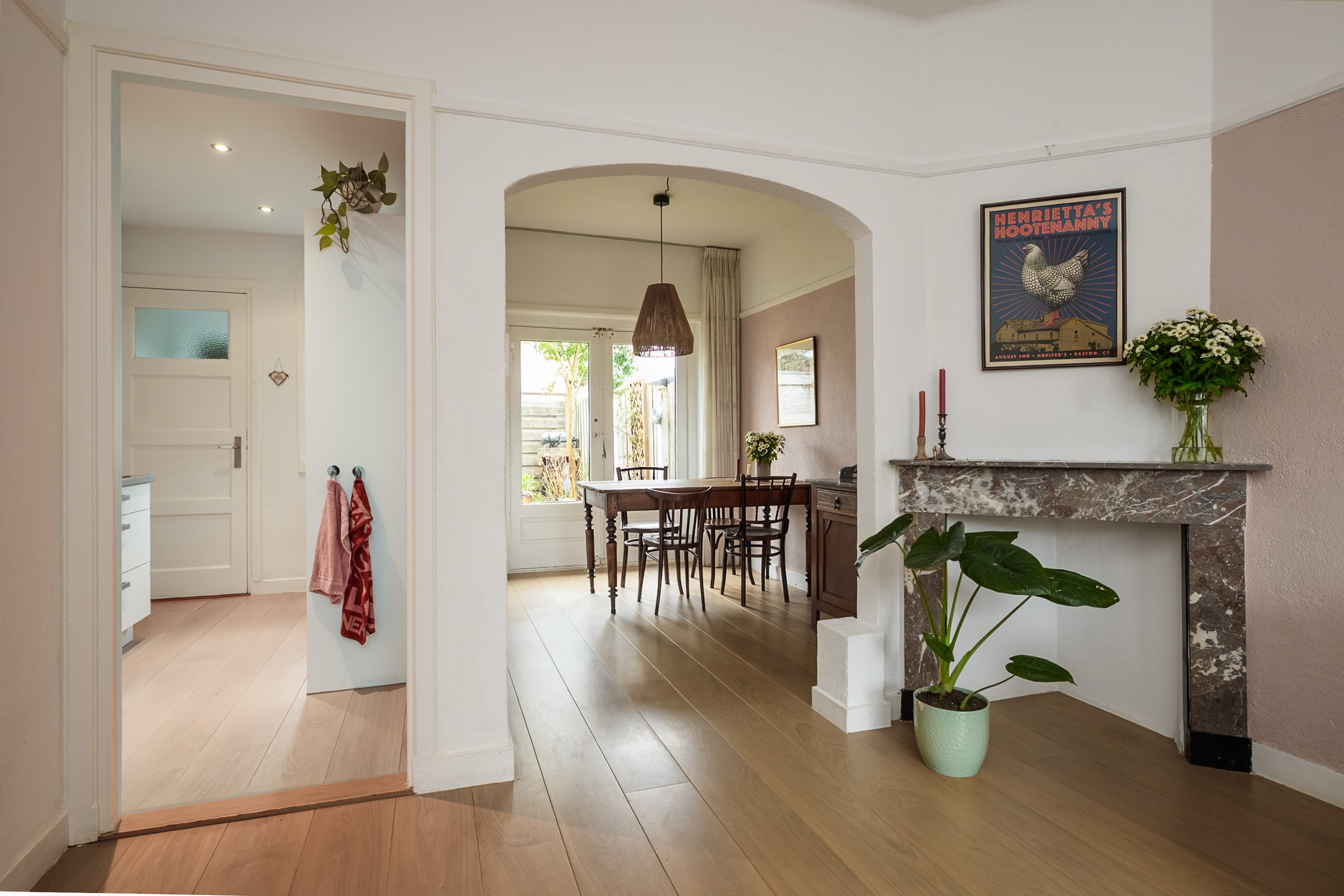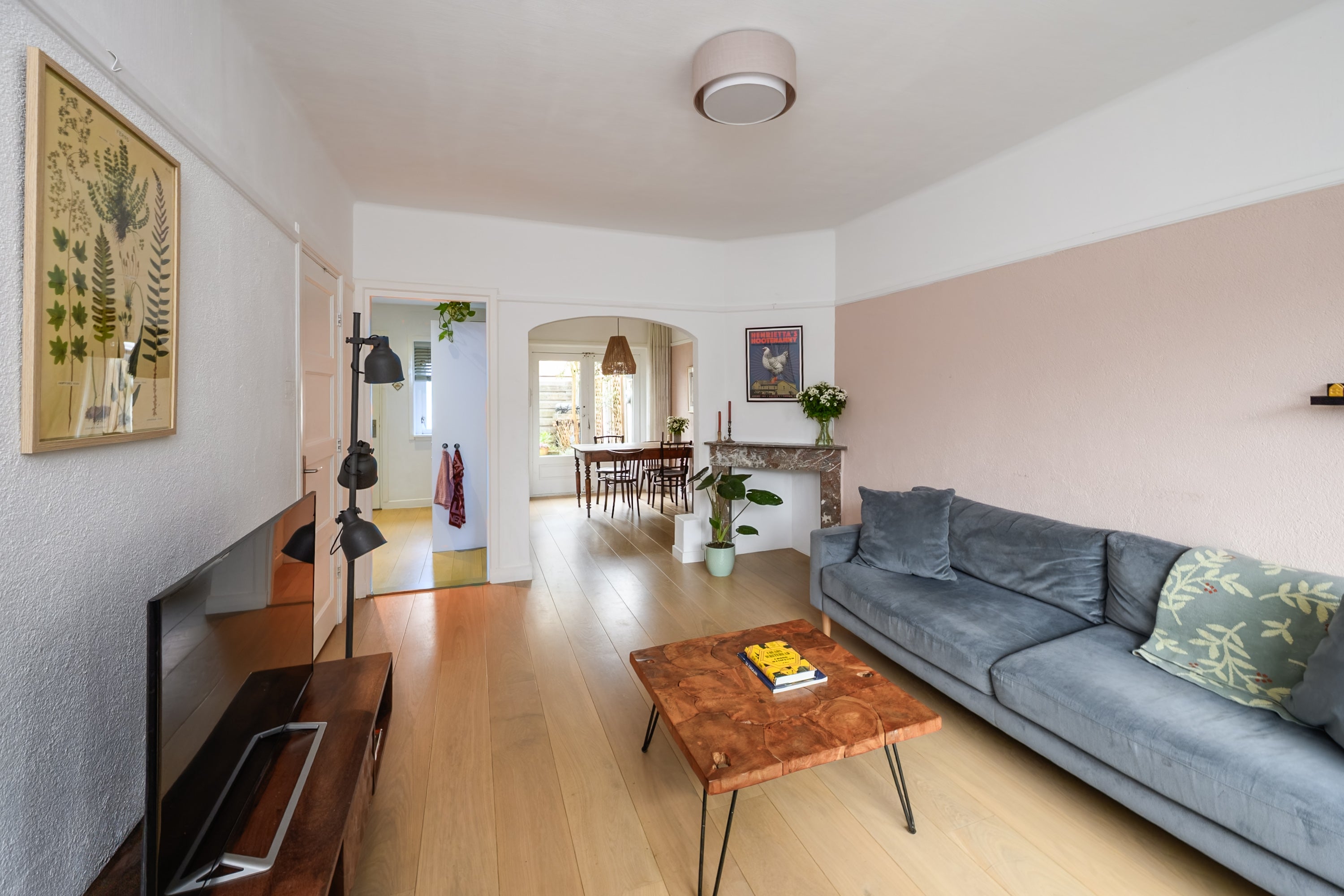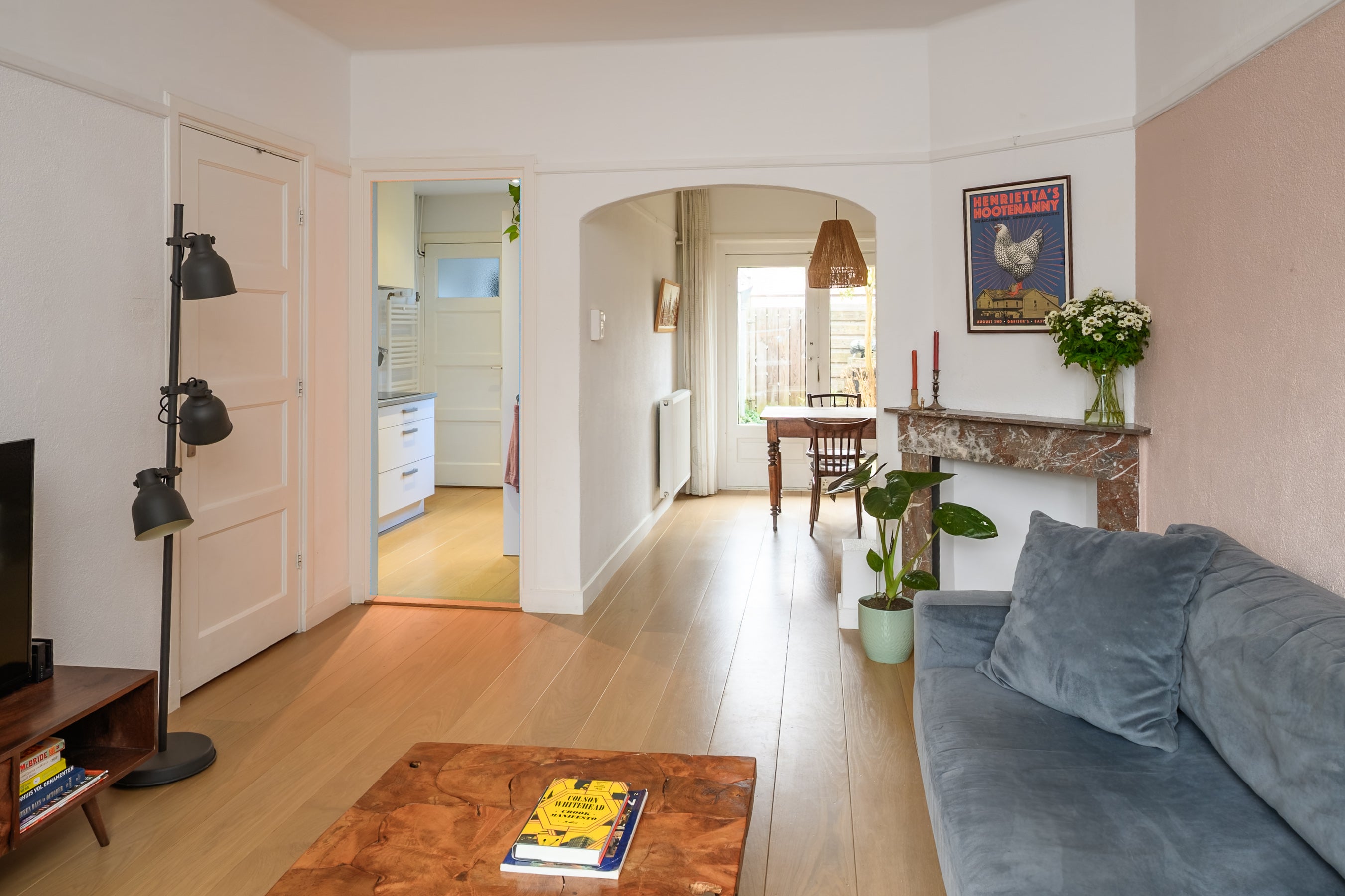 De begane grond heeft een entree met hal en trapopgang, een woon-/eetkamer met natuurstenen schouw en openslaande deuren naar de tuin. De moderne keuken is voorzien van een inductiekookplaat, combi-oven en vaatwasser. Op de eerste verdieping bevinden zich twee slaapkamers en een moderne badkamer. De tweede verdieping biedt een voorzolder met dakkapel en een zolderkamer. Deze woning heeft 88 m² woonoppervlak en drie slaapkamers.