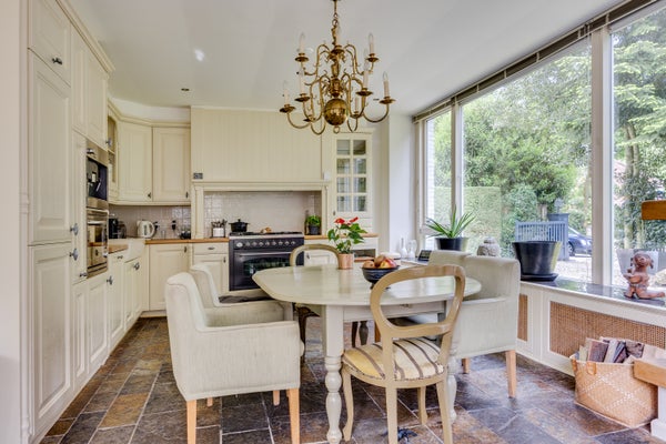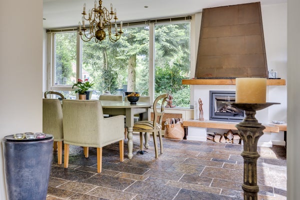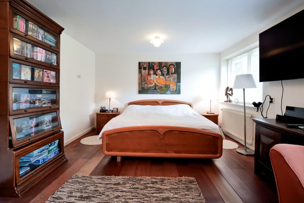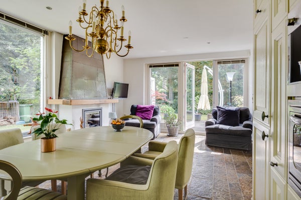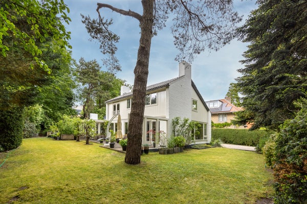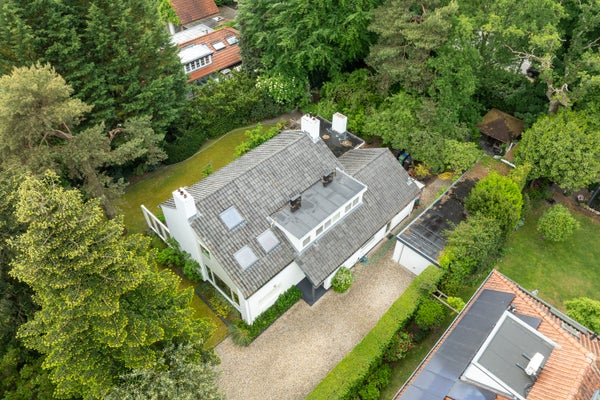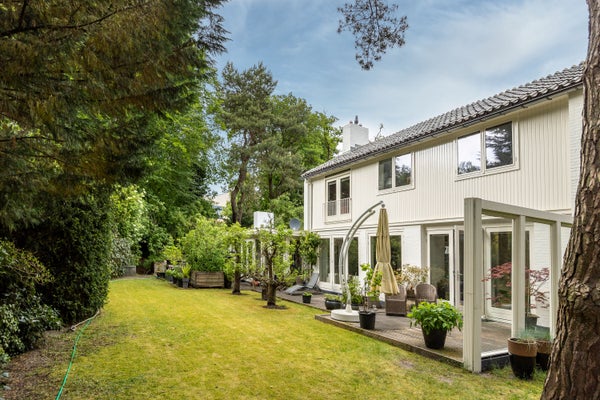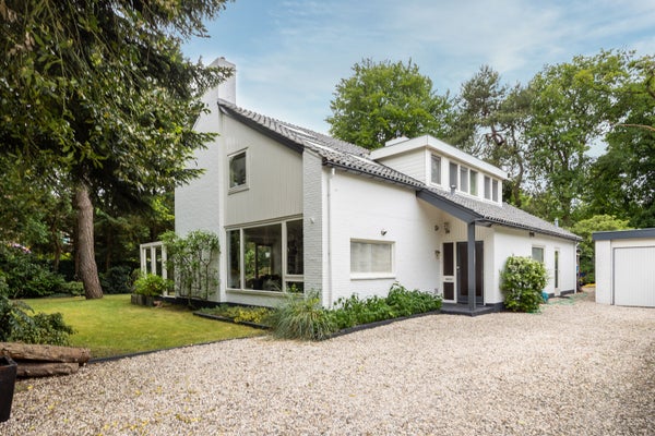 Deze vrijstaande villa, gebouwd in 1957, ligt in een bosrijke omgeving aan een rustige, kindvriendelijke laan. Het perceel van 1.322 m² omvat een verwarmde garage van ca. 13 meter diep, een tuinhuisje en een oprit voor meerdere auto's. De villa is onderkelderd en beschikt over daglicht door drie openslaande ramen. Op de begane grond bevindt zich een ruime woonkamer met openslaande deuren naar het terras, een woon/eetkeuken met moderne apparatuur, een grote serre, een studeerkamer en een bijkeuken. De eerste etage heeft drie slaapkamers en een badkamer met whirlpool. De tuin is voorzien van fruitbomen en een prachtige beuk van ongeveer 125 jaar oud. De totale woonoppervlakte is 352 m².