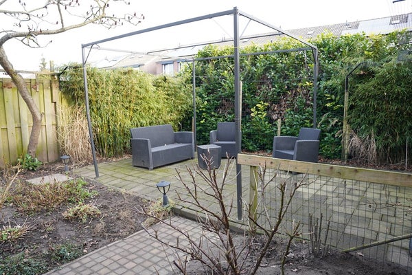 De tuin is netjes aangelegd, onderhoudsvriendelijk en met meerdere terrassen. Het verhoogde terras met zonnescherm is een heerlijke plek om te zitten, terwijl het lagere terras en de grote poort zorgen voor extra en praktisch gebruiksgemak.