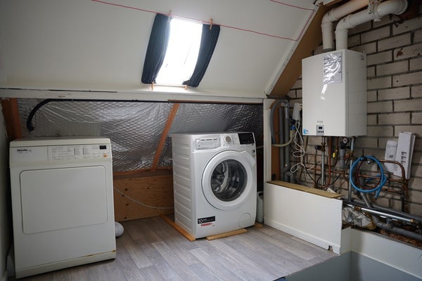 De tweede verdieping biedt extra ruimte en mogelijkheden. Hier vind je de aansluiting voor wasmachine en droger, bergruimte en de cv-installatie.