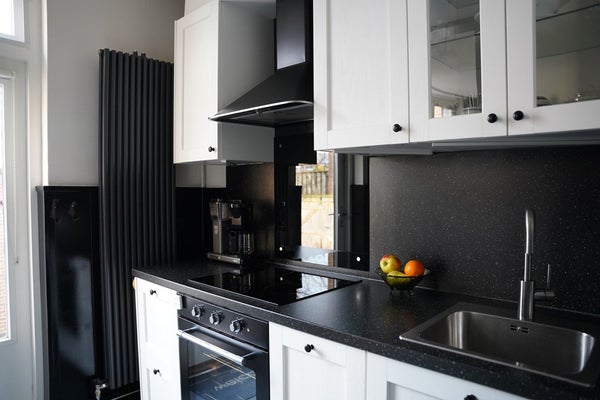 De keuken, geplaatst in 2020, is praktisch ingericht en voorzien van oven, kookplaat en afzuigkap. Een fijne plek om dagelijks te koken, met zicht op de tuin.
