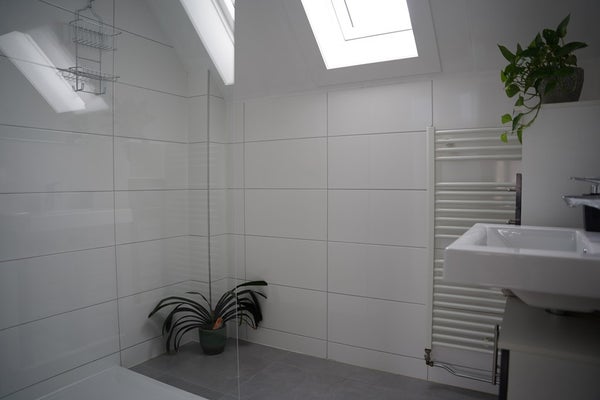 De badkamer is praktisch ingericht met een inloopdouche en wastafel. Een dakraam zorgt hier voor prettig daglicht en ventilatie.