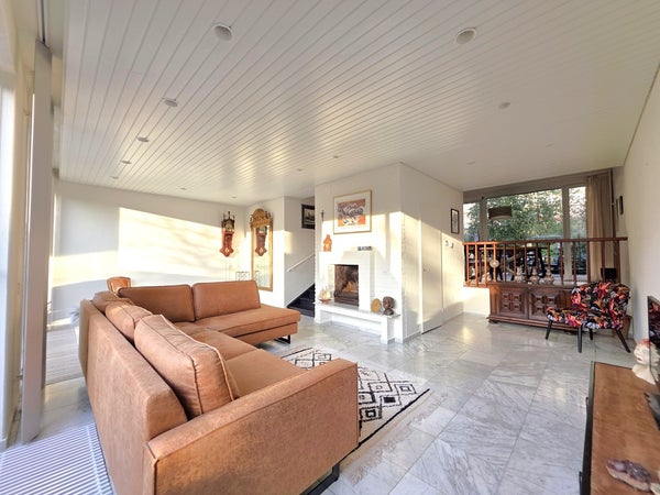 Aan de voorzijde bevindt zich een woonkamer voorzien van een open haard, grote glaspartijen, ruime trapkast en carrara marmeren vloer. Ook hier is de tuin zo ingericht dat je als bewoner over veel privacy beschikt.